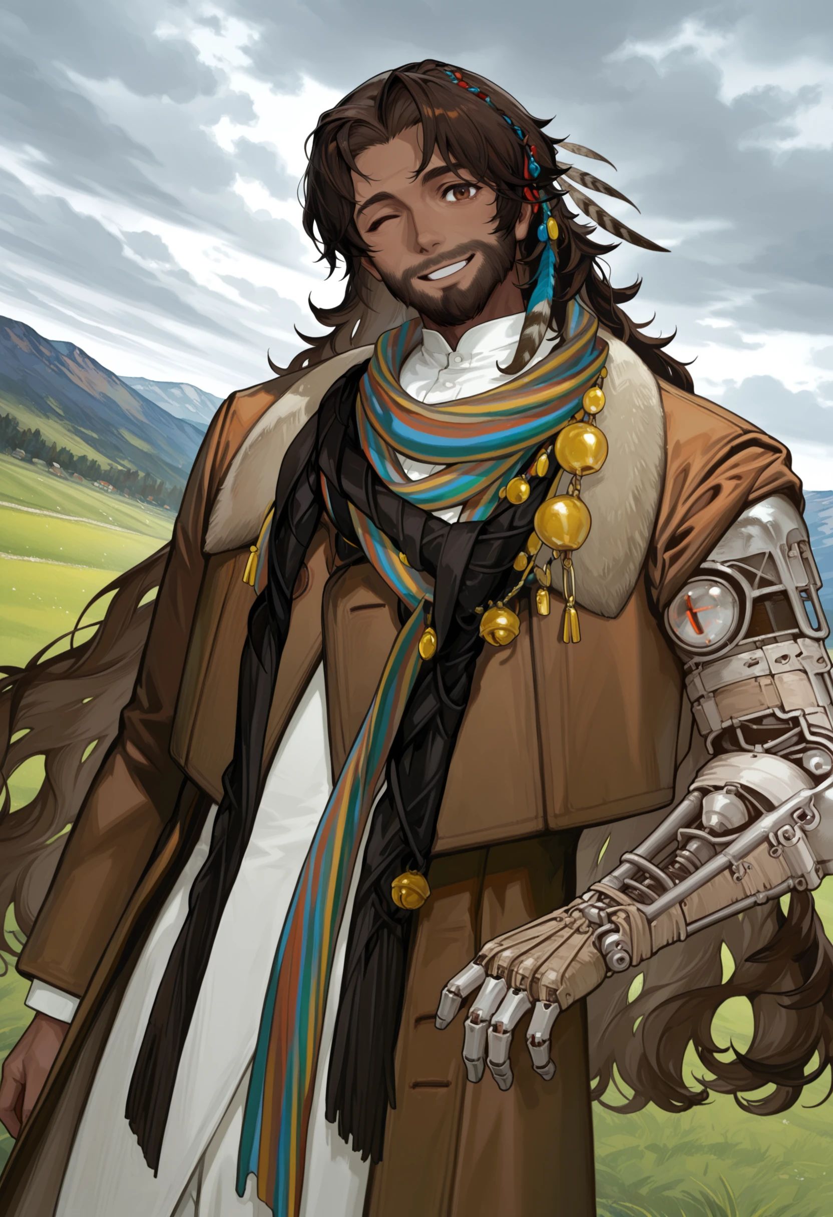 Tags: sh4mane, sh4mane_b, brown hair, brown eyes, very long hair, ponytail, facial hair, beard, single mechanical arm, prosthesis, dark-skinned male,