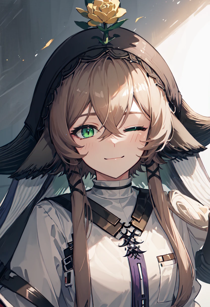 The trigger word is pallas_arknights, and the pruned tags are brown_hair, horns, animal_ears, cow_horns, cow_ears, green_eyes, cow_girl, hair_between_eyes, flower_on_head, long_hair, sidelocks.