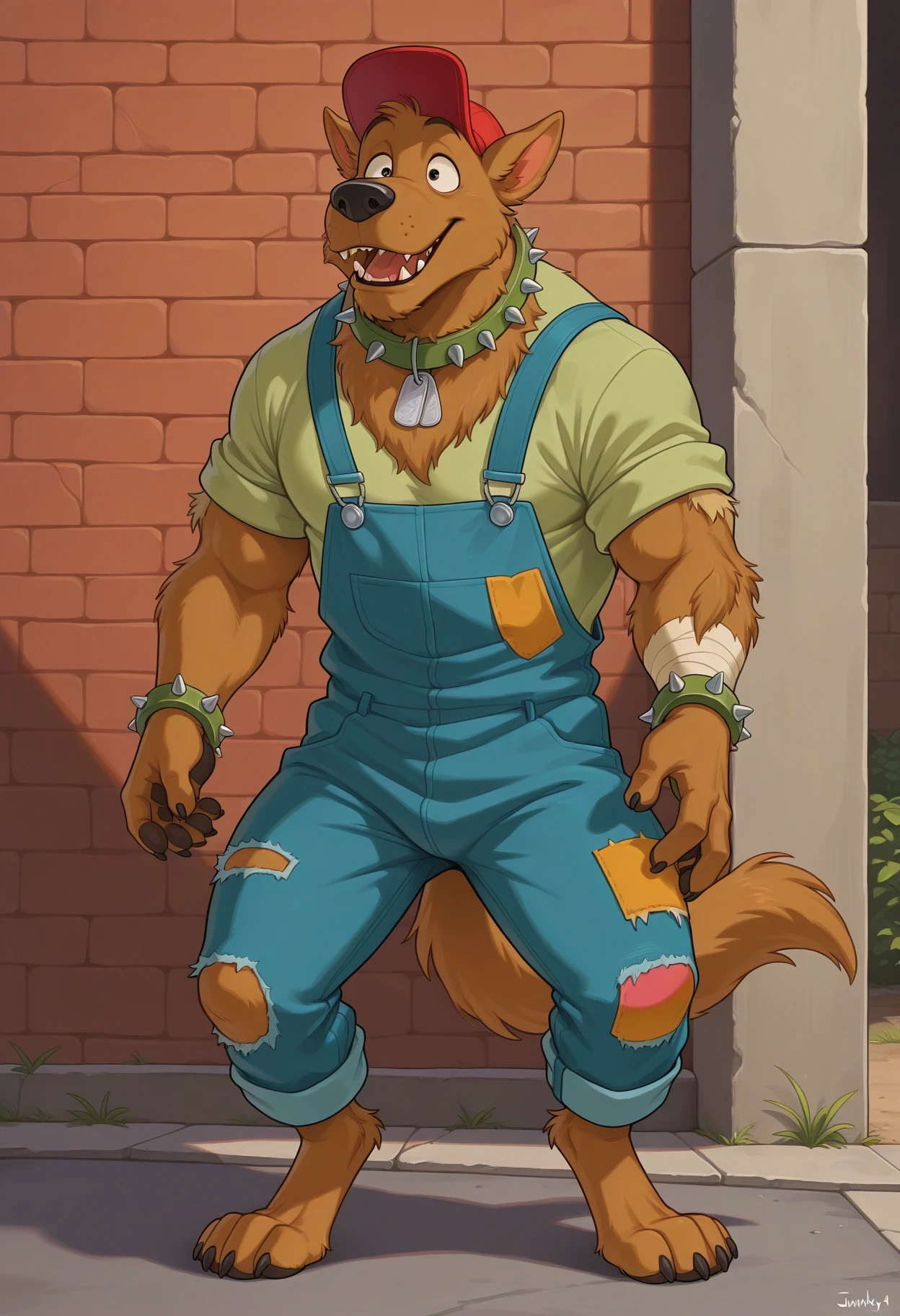 junky4rd, dog, red hat, spiked collar, dog tags, spiked bracelet, chain bracelet, bandaged wrist, junkyard's overalls, green shirt,