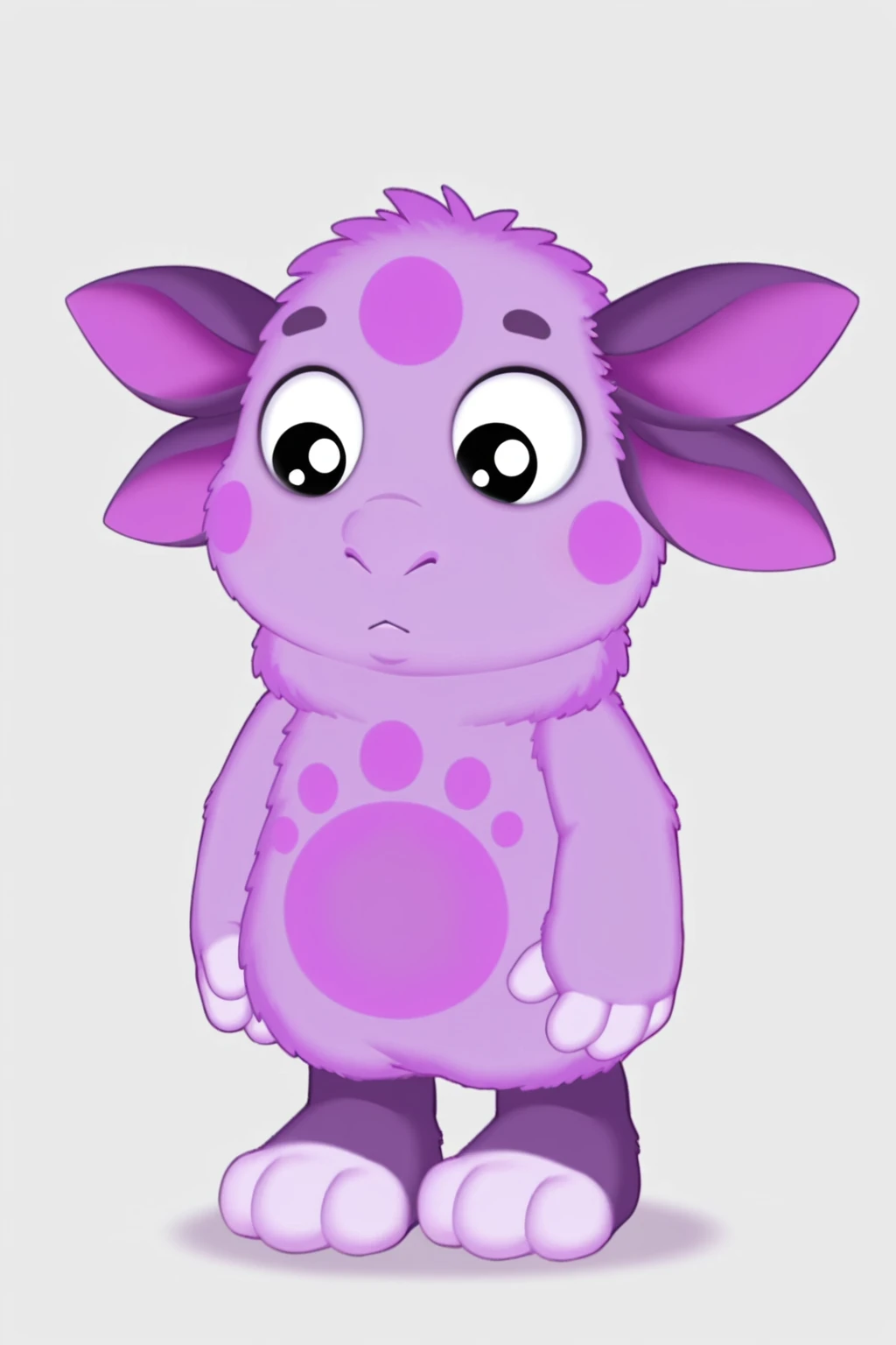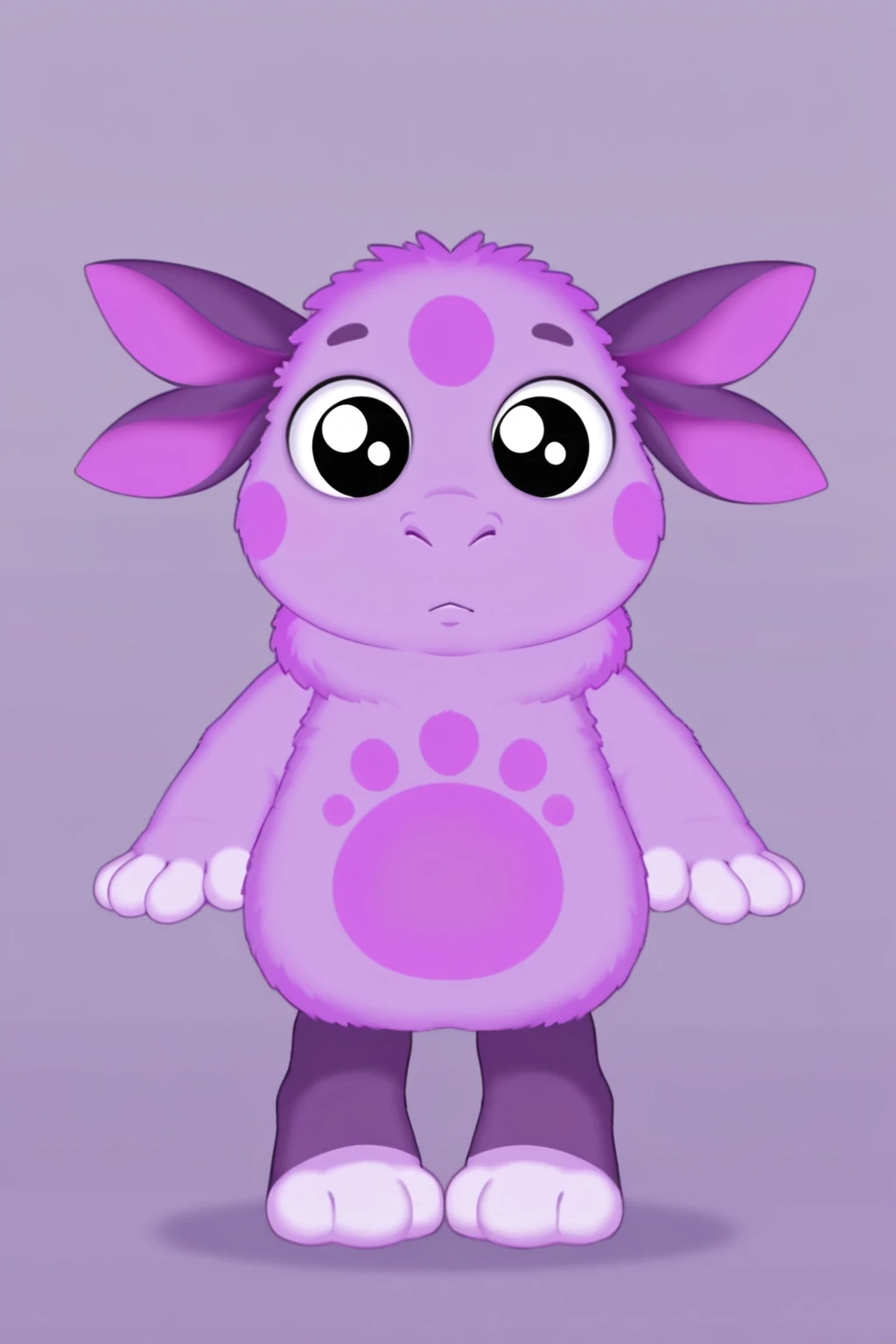 It is reliably known that Moonzy hatched from an egg, like modern reptiles. However, Moonzy considers himself to be one of the bees, specifically, a moon bee. Contrary to this, Moonzy has nothing in common with bees. He has different coloration, a larger build and consequently more weight, and he lacks wings. Moonzy himself is completely covered in purple fur, including his torso, head, arms, legs, ears, and nose. Moonzy has two legs and two arms. Unlike insects, Moonzy has something resembling double ears instead of antennae, which further diminishes any resemblance Moonzy might have to bees, or to insects in general. Moonzy has one large spot on his belly and several smaller ones nearby, which together resemble the shape of a footprint. There is another spot on his forehead and two smaller ones on his cheeks; all the spots are a darker shade than the rest of his fur. He has barely noticeable lilac hair styled in a crew cut. At the back, there is a small tail, the same color as Moonzy's entire body. It is unknown how, but Moonzy somehow can breathe both underwater and even in outer space, which is why he often visits the pond's inhabitants.