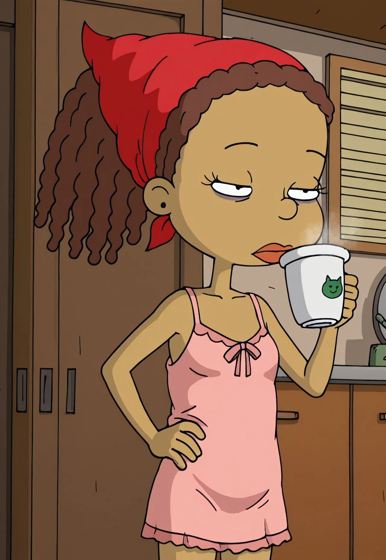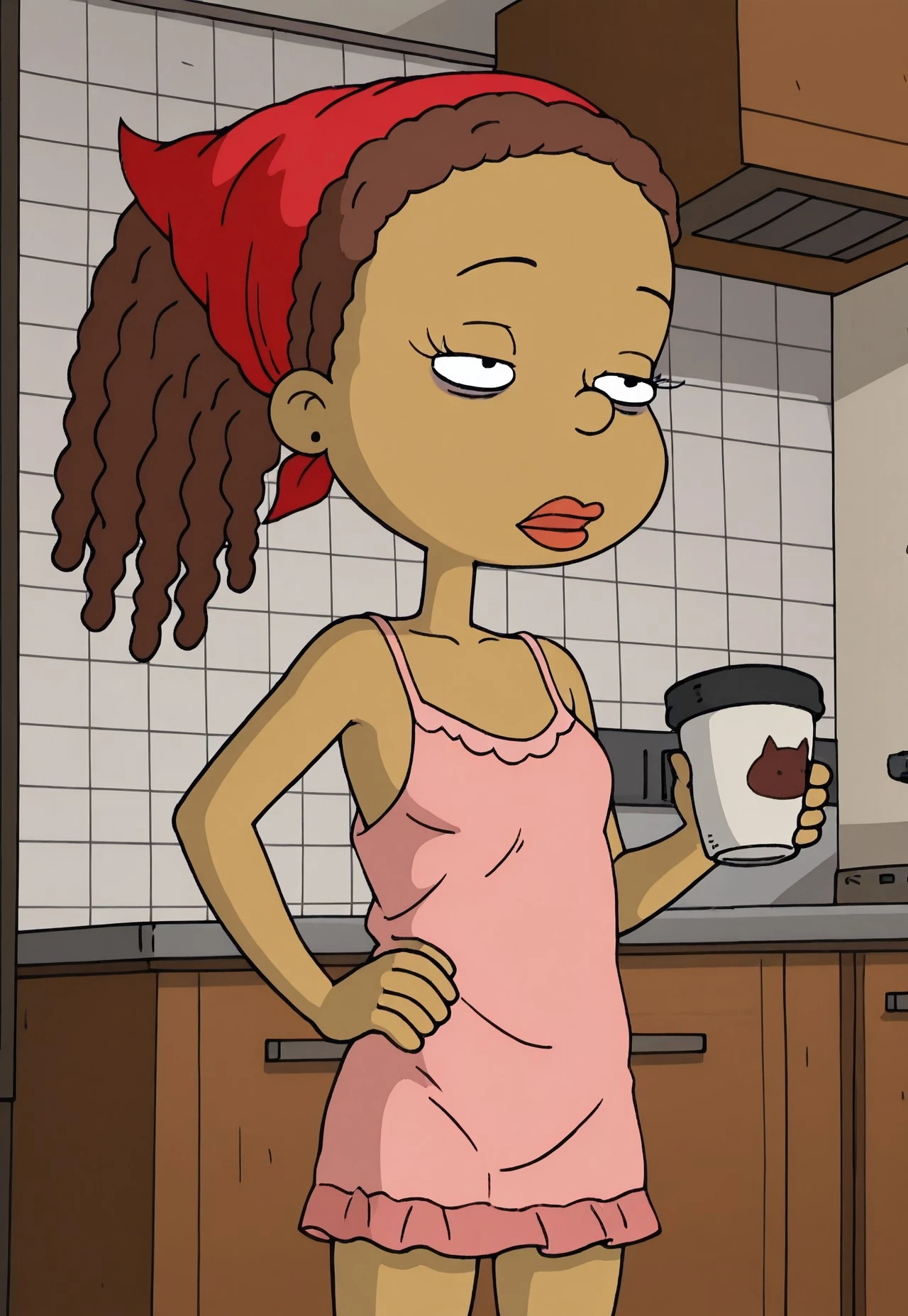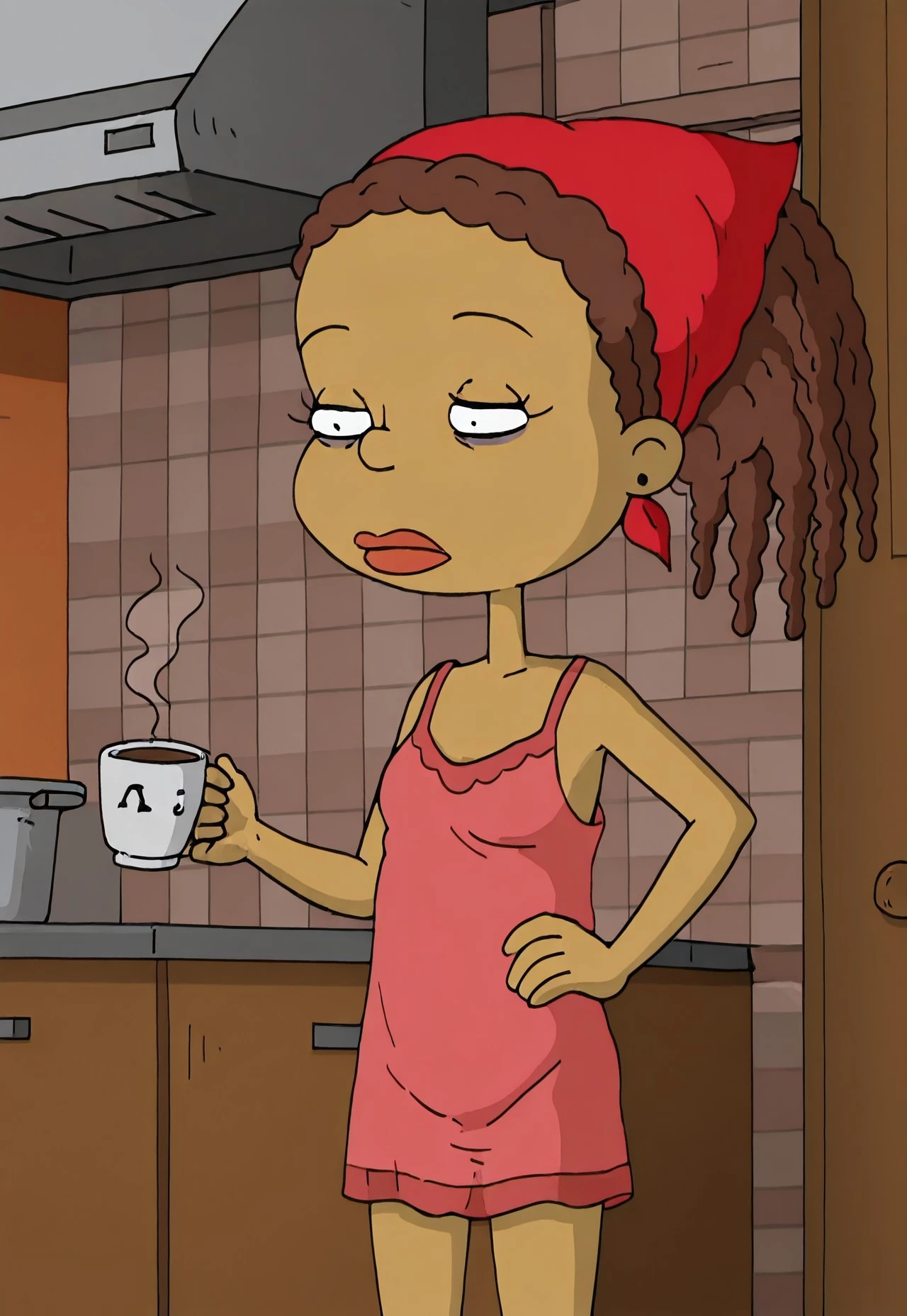 Susie Carmichael, 1girl, brown hair in dreadlocks, hair tied back, dark skin, brown skin, red bandana, purple earrings, green jacket, light pink and dark pink stripes, grey pants, red shoes, black belt