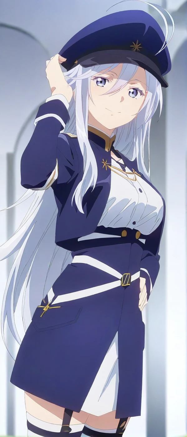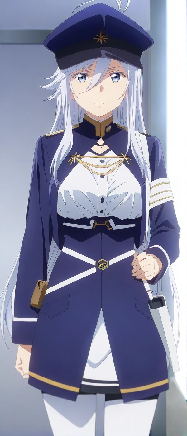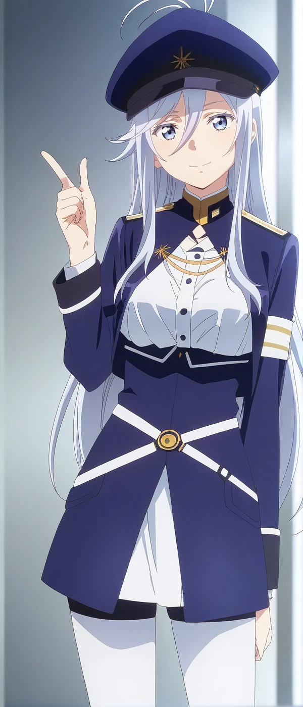 Military hat, military uniform, blue headwear, blue jacket, white shirt, zettai ryouiki, white thighhighs, anime coloring