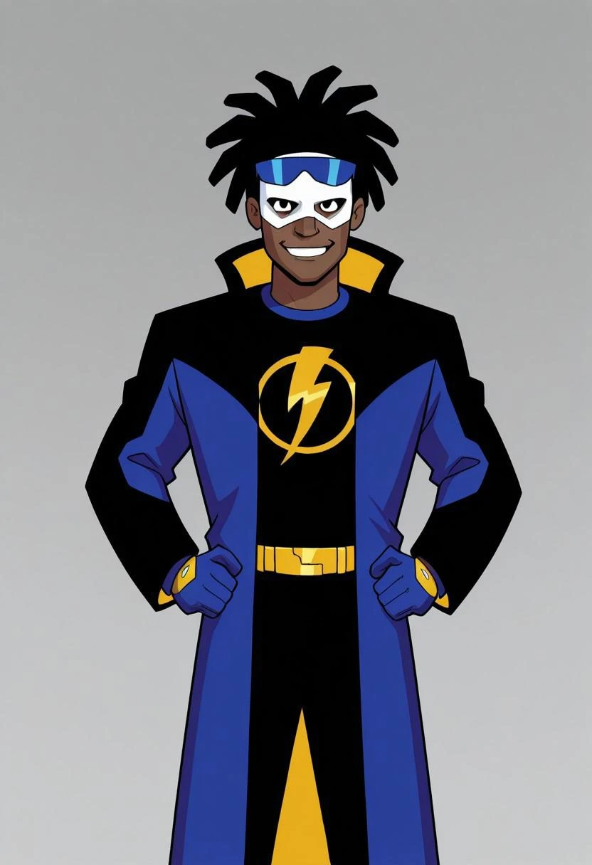 1boy, solo, Static_Shock, dark-skinned male, black eyes, black hair, dreadlocks, white mask, blue sunglasses on head, Blue overcoat, yellow innercoat, blackshirt, yellow belt, black pants, insignia, blue gloves, blue boots,