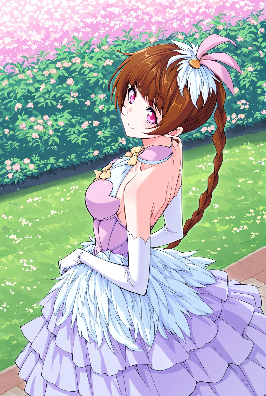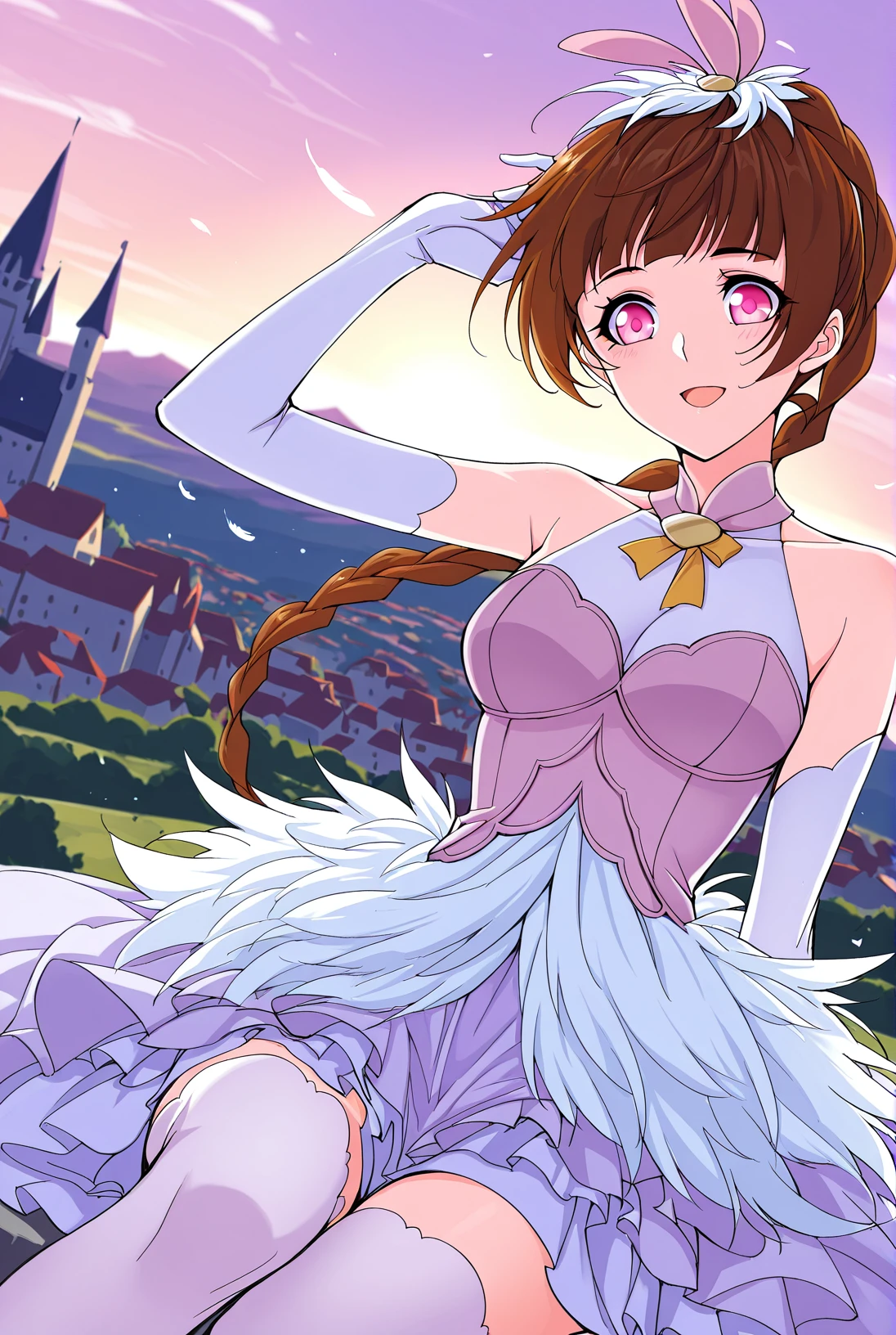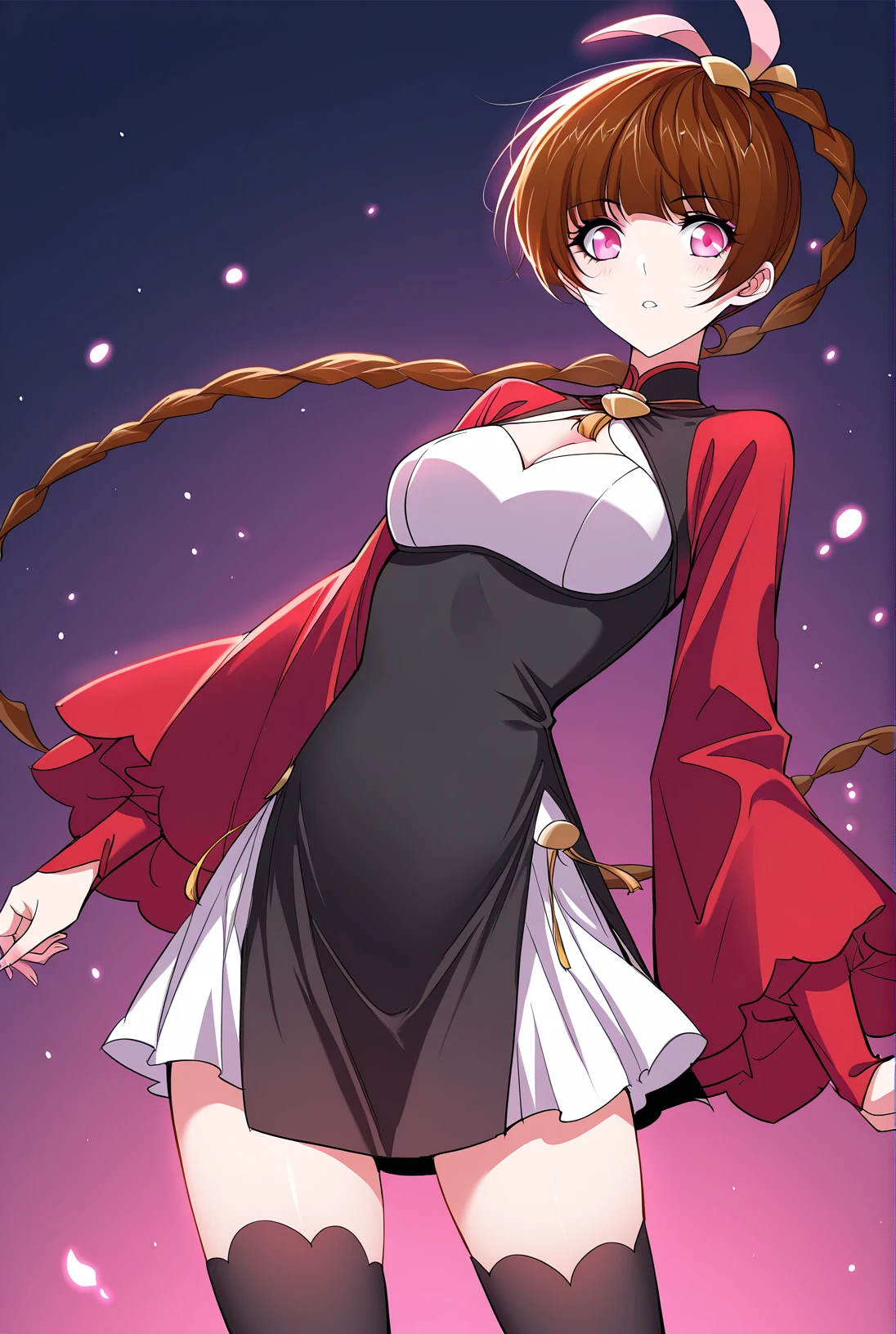 Xiao, 1 girl, solo, pink eyes, short hair, brown hair, blunt bangs, long braid, side braid, hair ornament, rabbit ear accessory, hair bobbles,