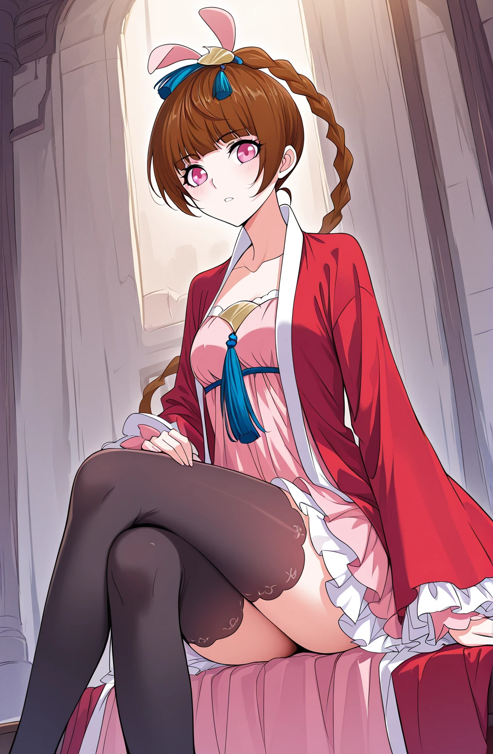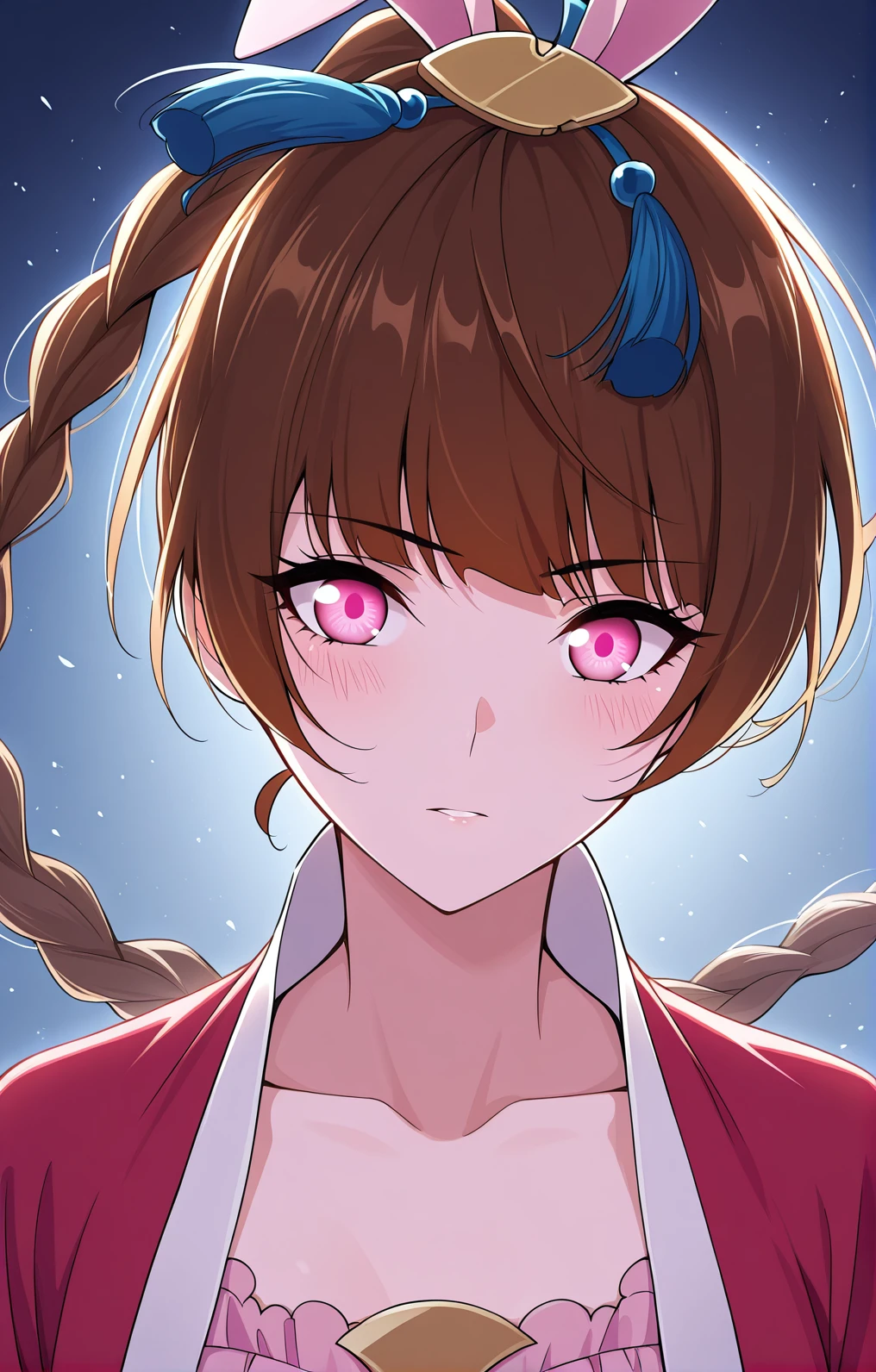 Xiao, 1 girl, solo, pink eyes, short hair, brown hair, blunt bangs, long braid, side braid, pink ribbon, bunny ear ribbon, blue tassel, gold hairpin, traditional hair accessory,