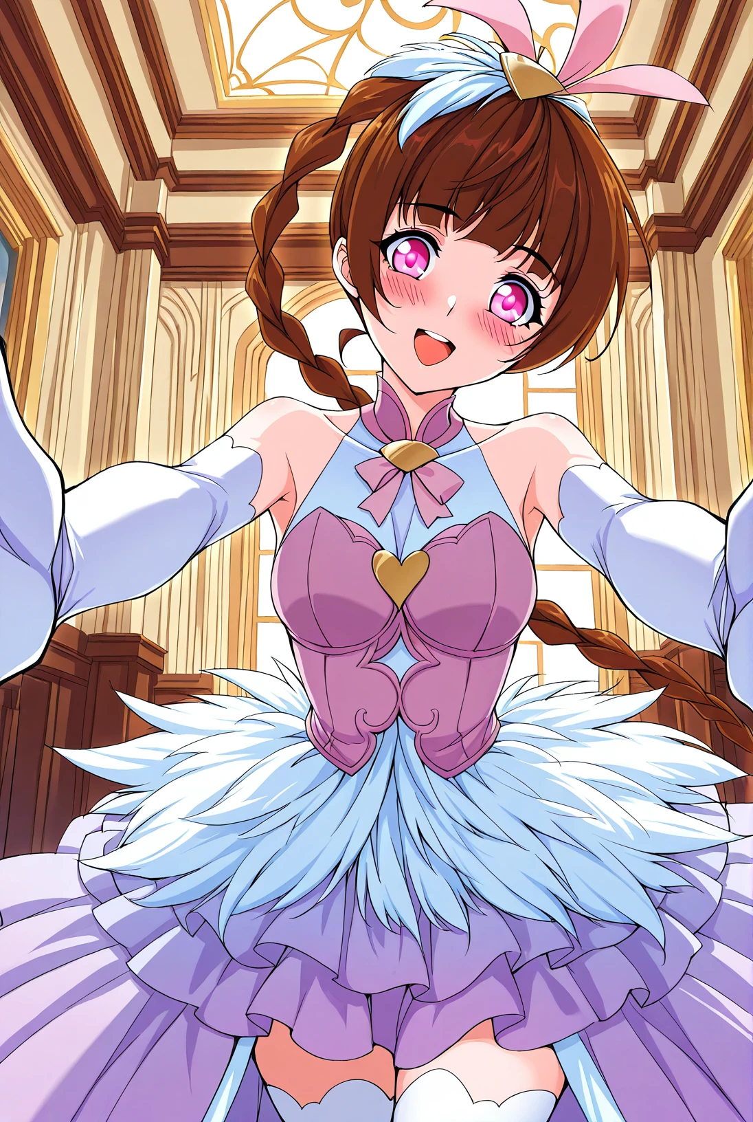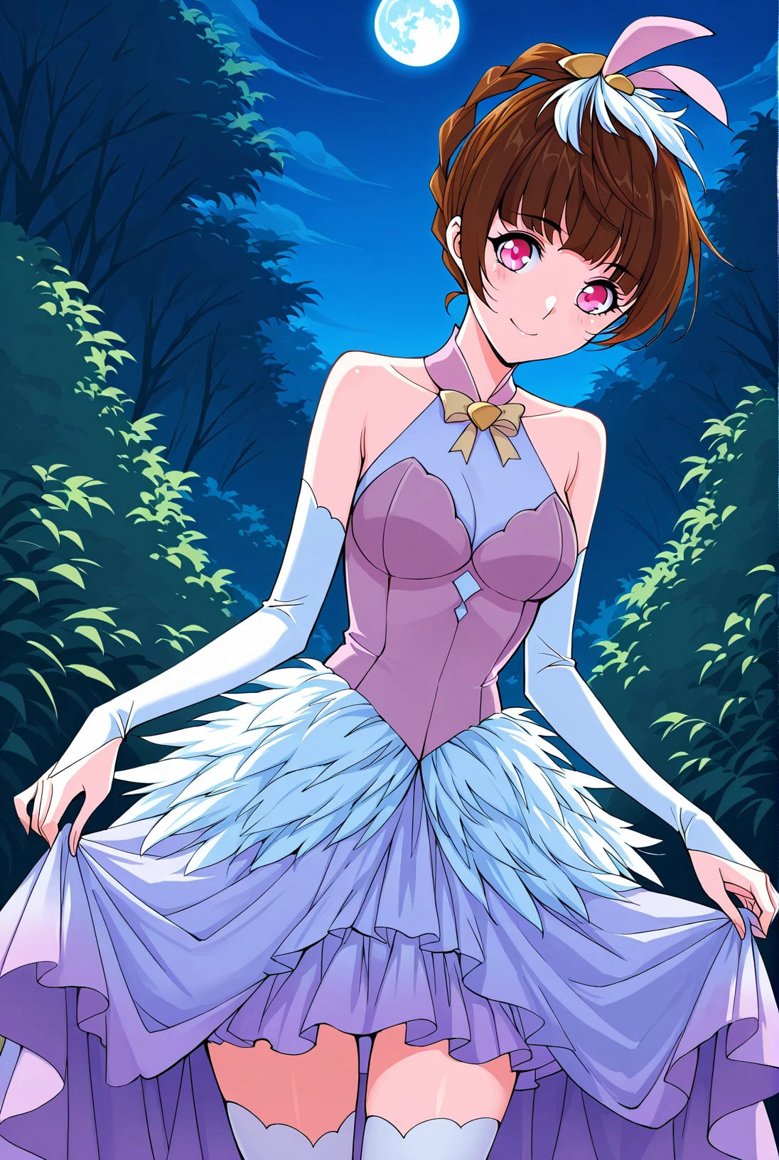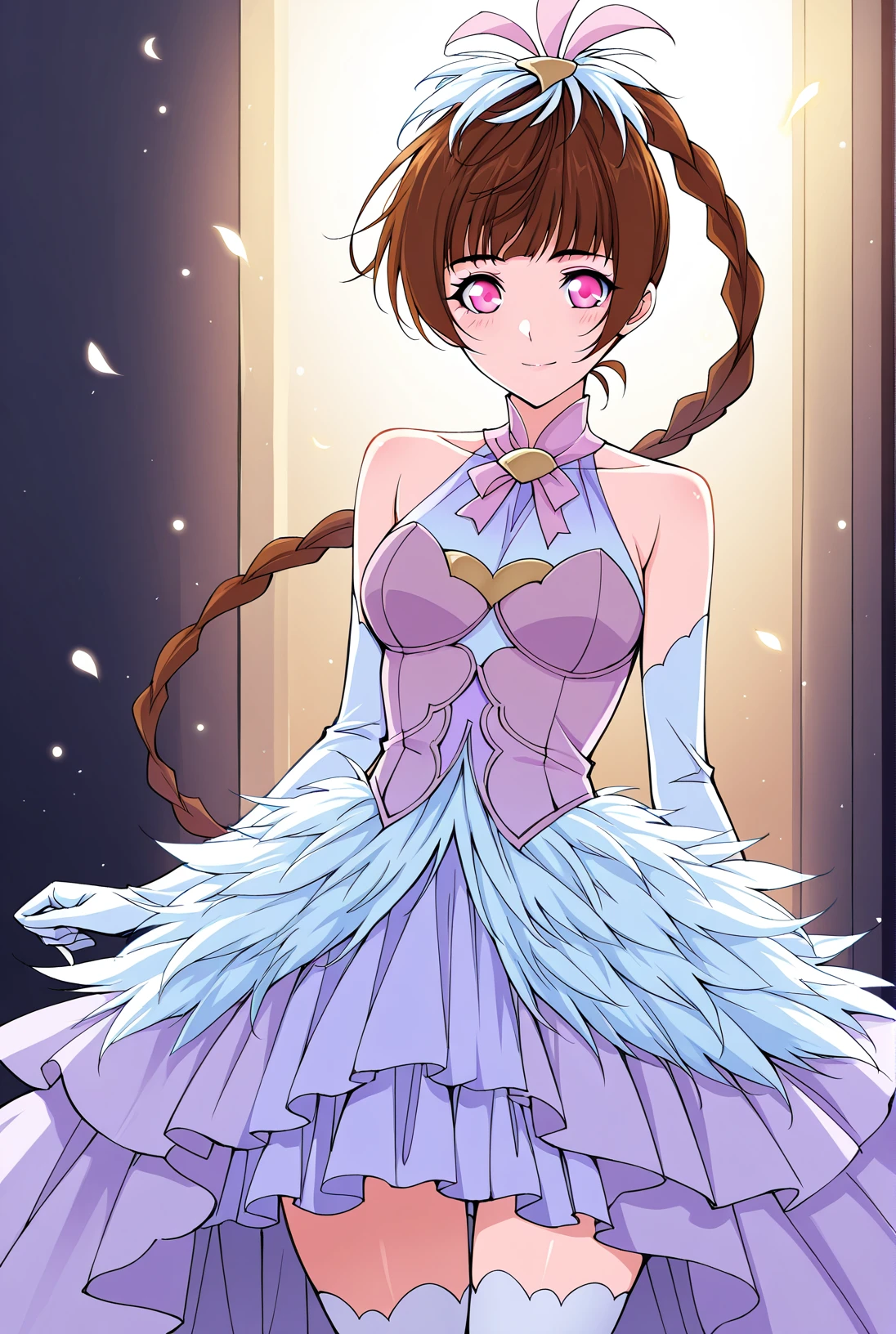 Xiao_feathers, feathered dress, strapless bodice, light purple dress, white accents, white feathers, halter neck, chest bow, high slit skirt, white gloves, long gloves, white thighhighs, layered skirt, light purple underskirt, backless outfit,