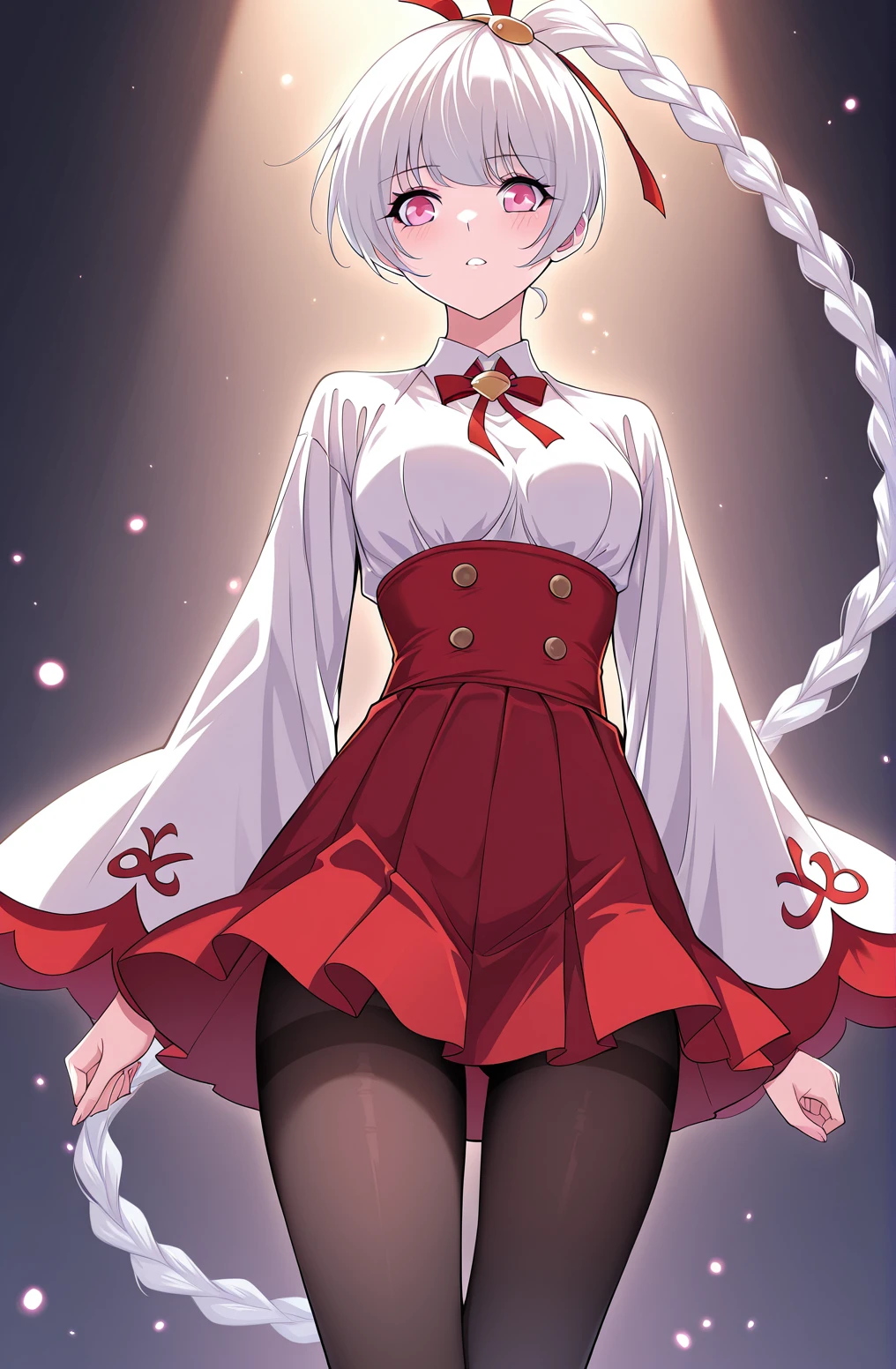 Xiao_BowFlare, white blouse, wide sleeves, red high-waisted skirt, pleated skirt, red ribbon bow, double-breasted buttons, red accents, short skirt, black pantyhose, red high heels,