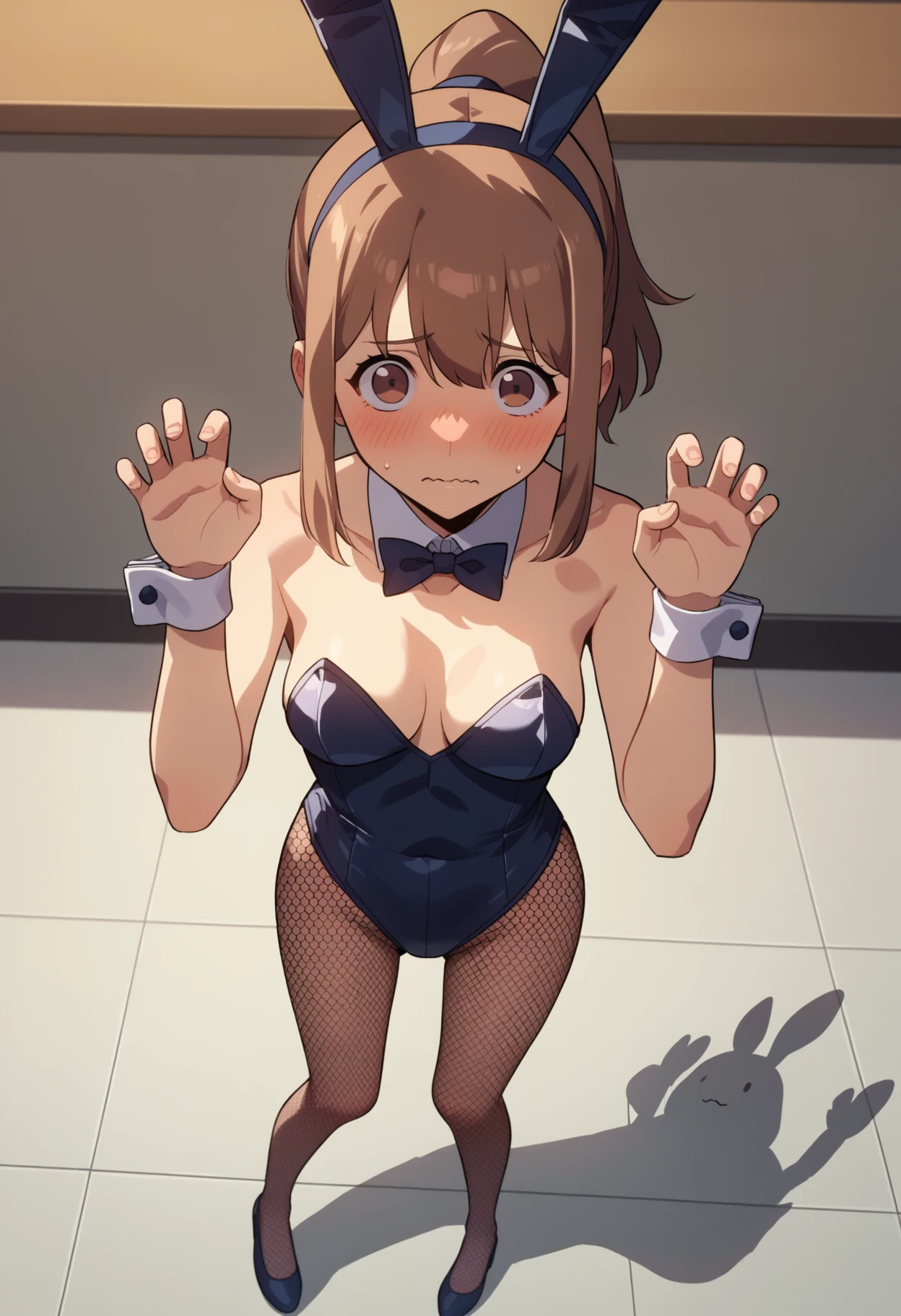 haedef, brown hair, brown eyes, ponytail, red jacket, white shirt, black shorts,
