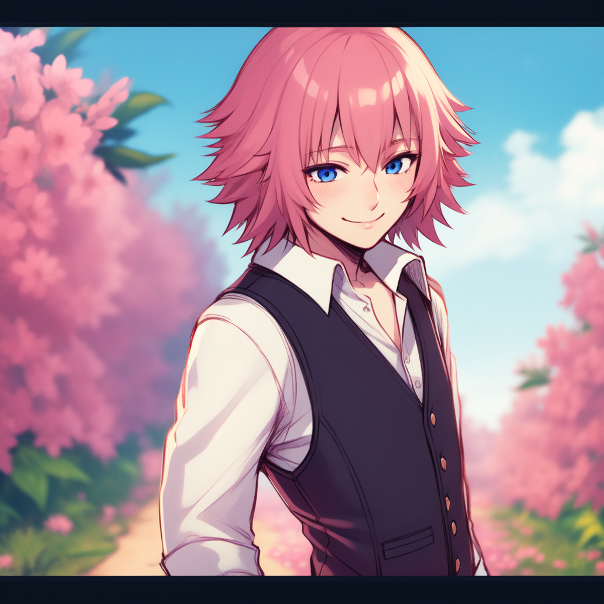 1boy, pink hair, blue eyes, white shirt, collared shirt, black vest, pink pants
