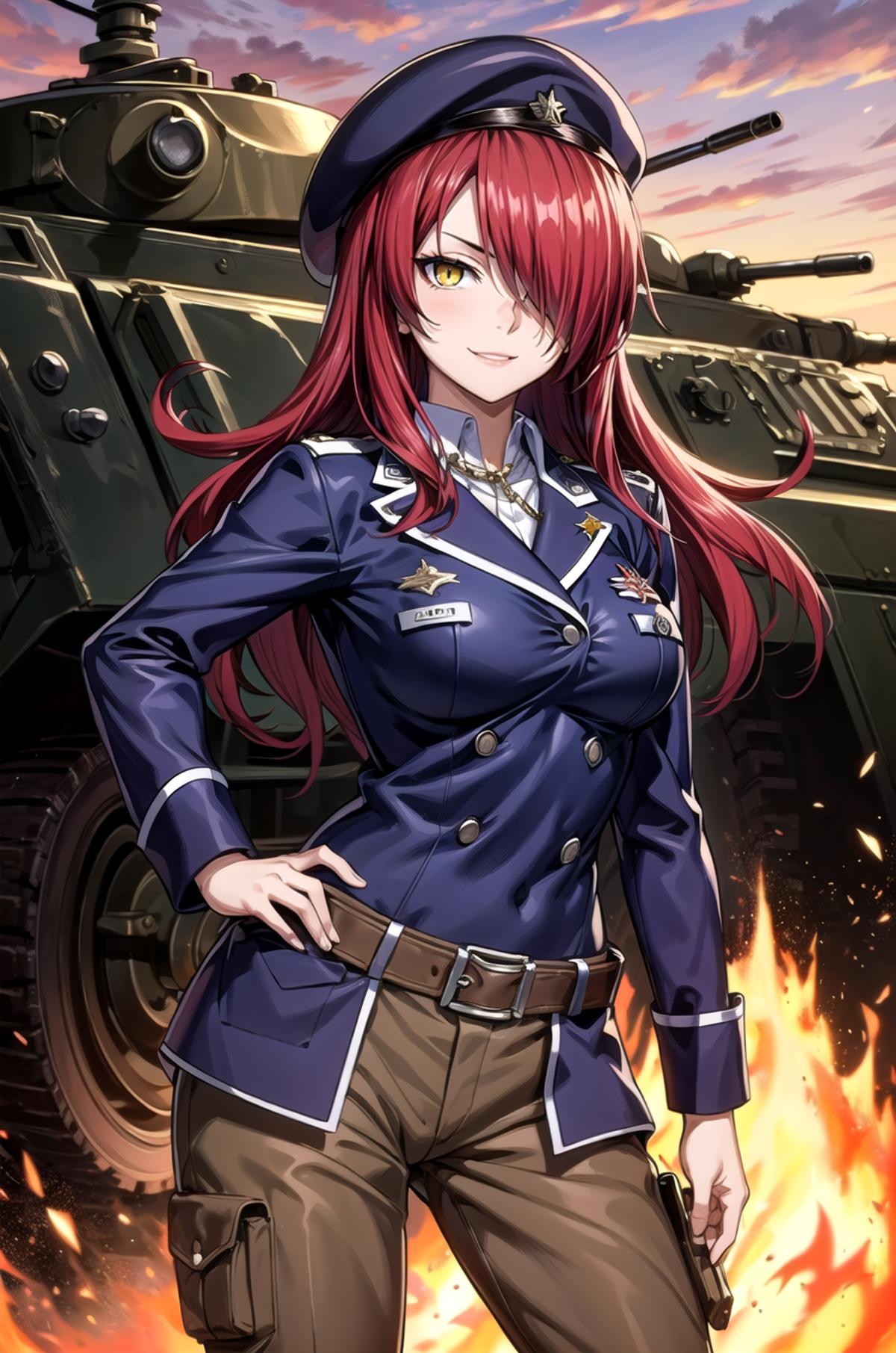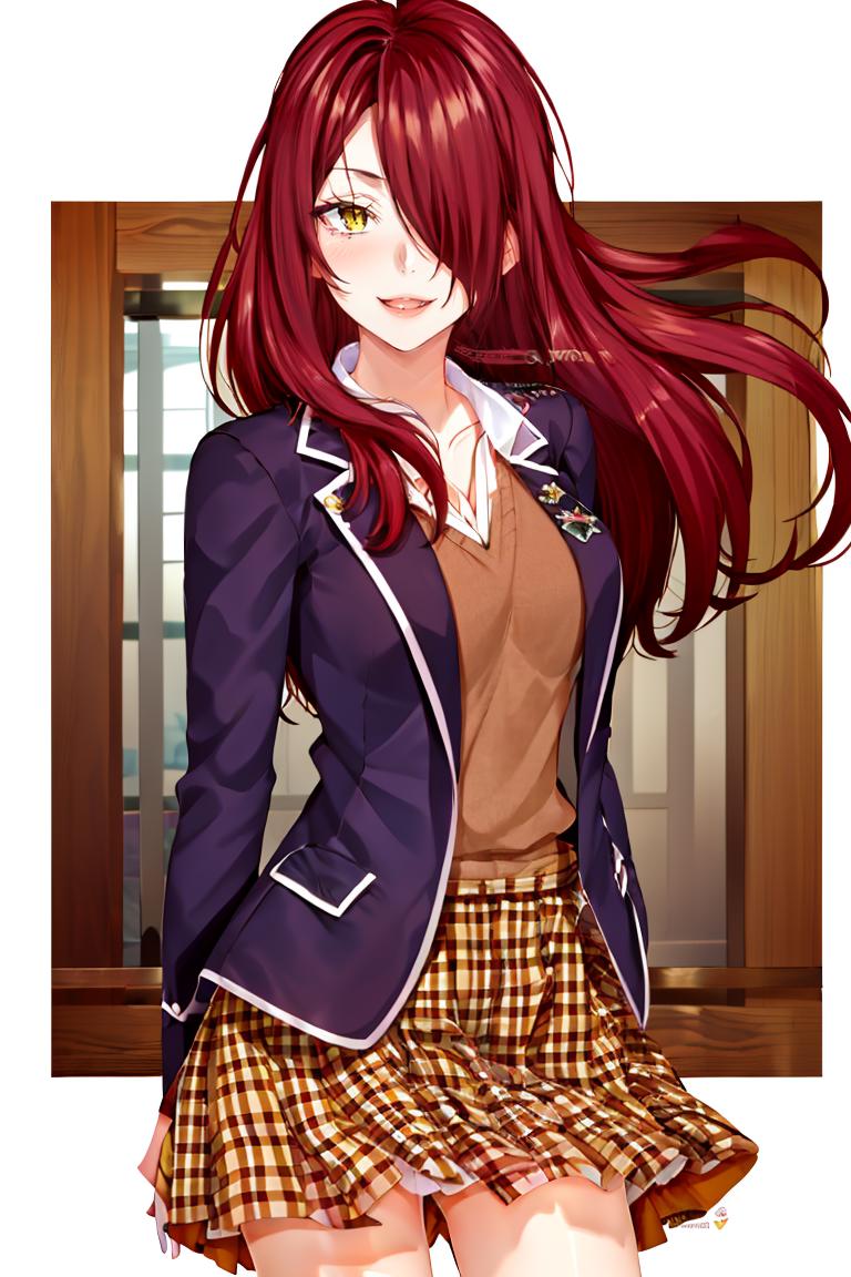 Kobayashi_Rindou_Shokugeki, 1girl, solo, red hair, long hair, hair over one eye, yellow eyes