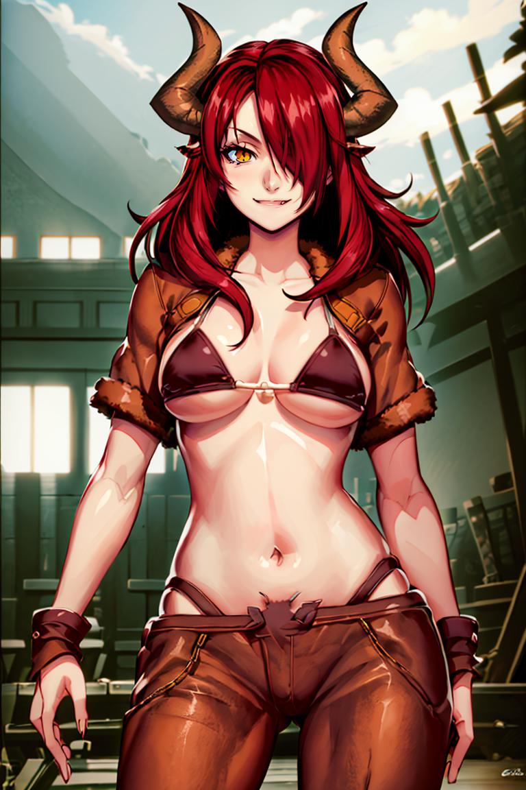 bikini, fur trim, horns, large breasts, leather(doesn't work very well. There arent many images of this outfit)