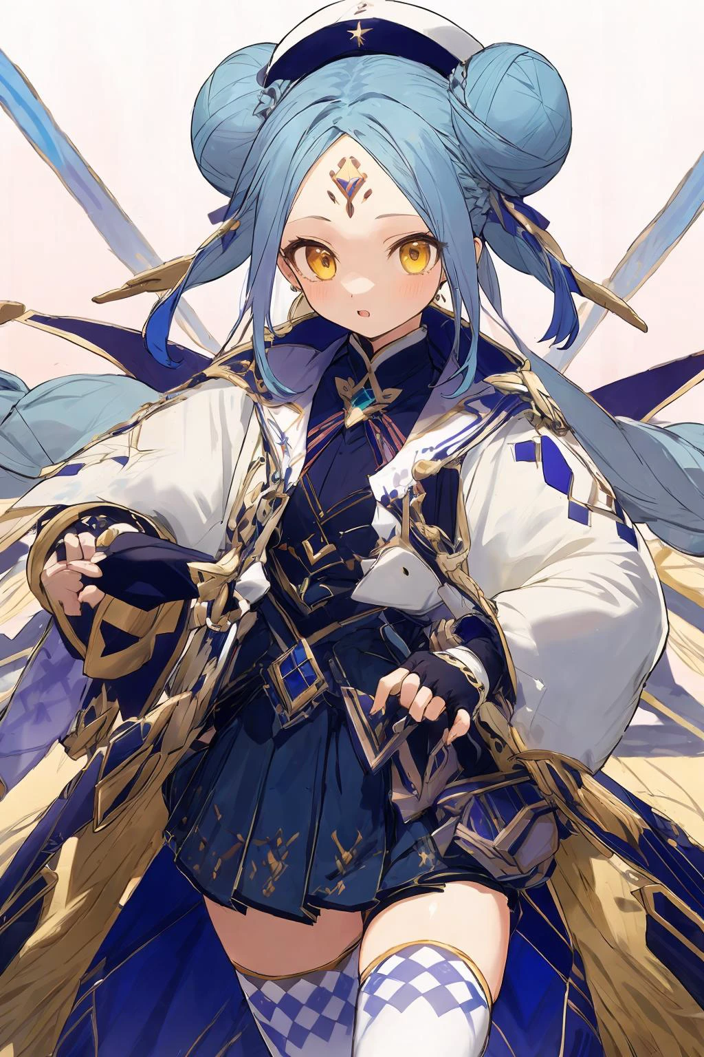 1girl, hat, braid,Light blue hair, thighhighs,yellow eyes,skirt, fingerless gloves, long sleeves,small double bun, white thighhighs,forehead jewel