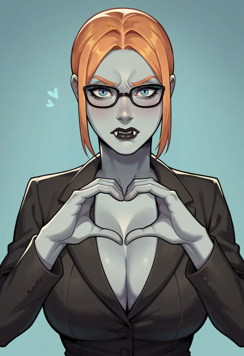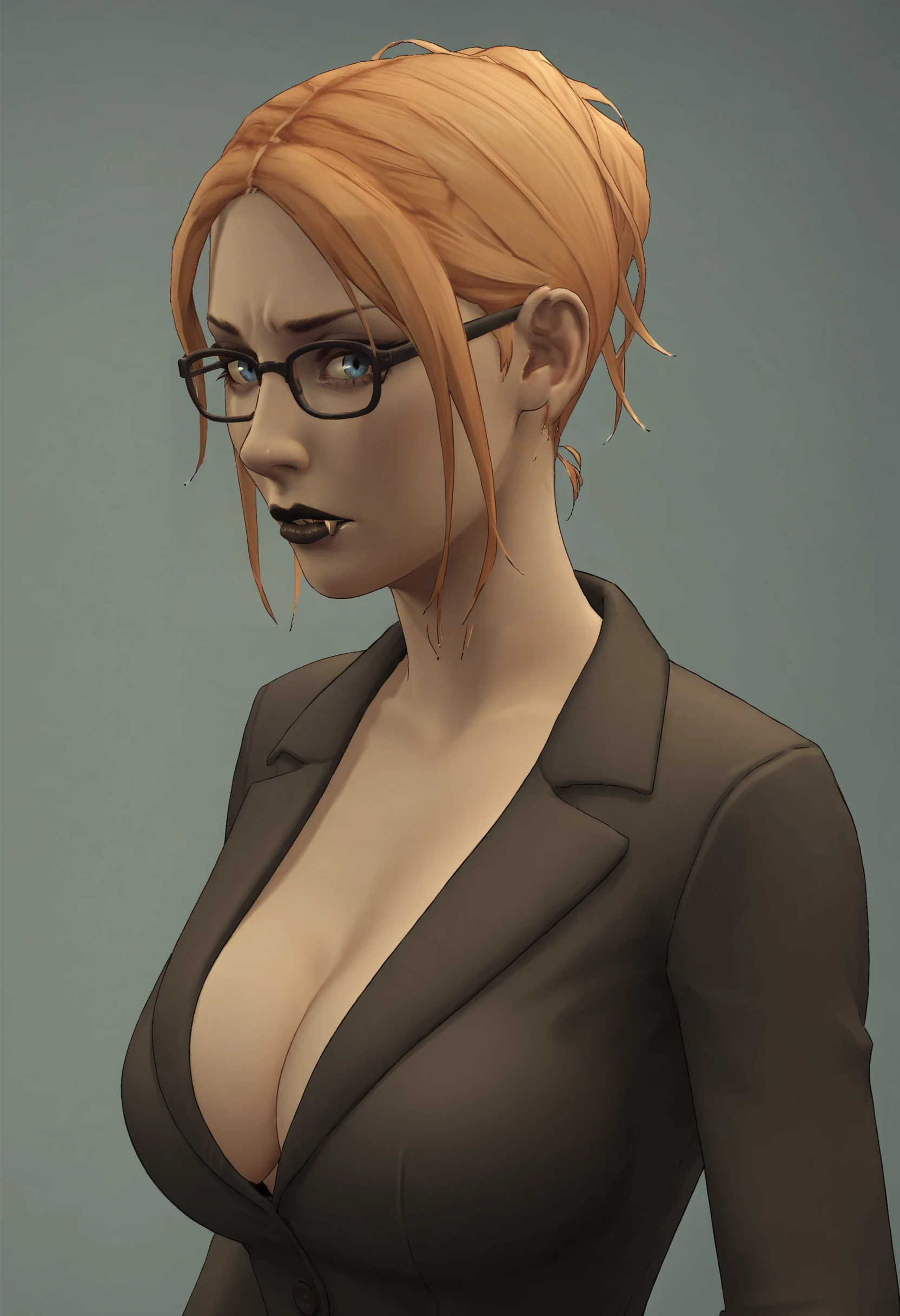 score_9, score_8_up, score_7_up, score_6_up, score_5_up, score_4_up, 1girl,<lora:TheresaVoerman:0.8> solo, formal, glasses, breasts, large breasts, cleavage, suit, black-framed eyewear, looking at viewer, pencil skirt, orange hair, blue eyes, black lips, side view, small fangs, looking at viewer, embarrassed, upper body,