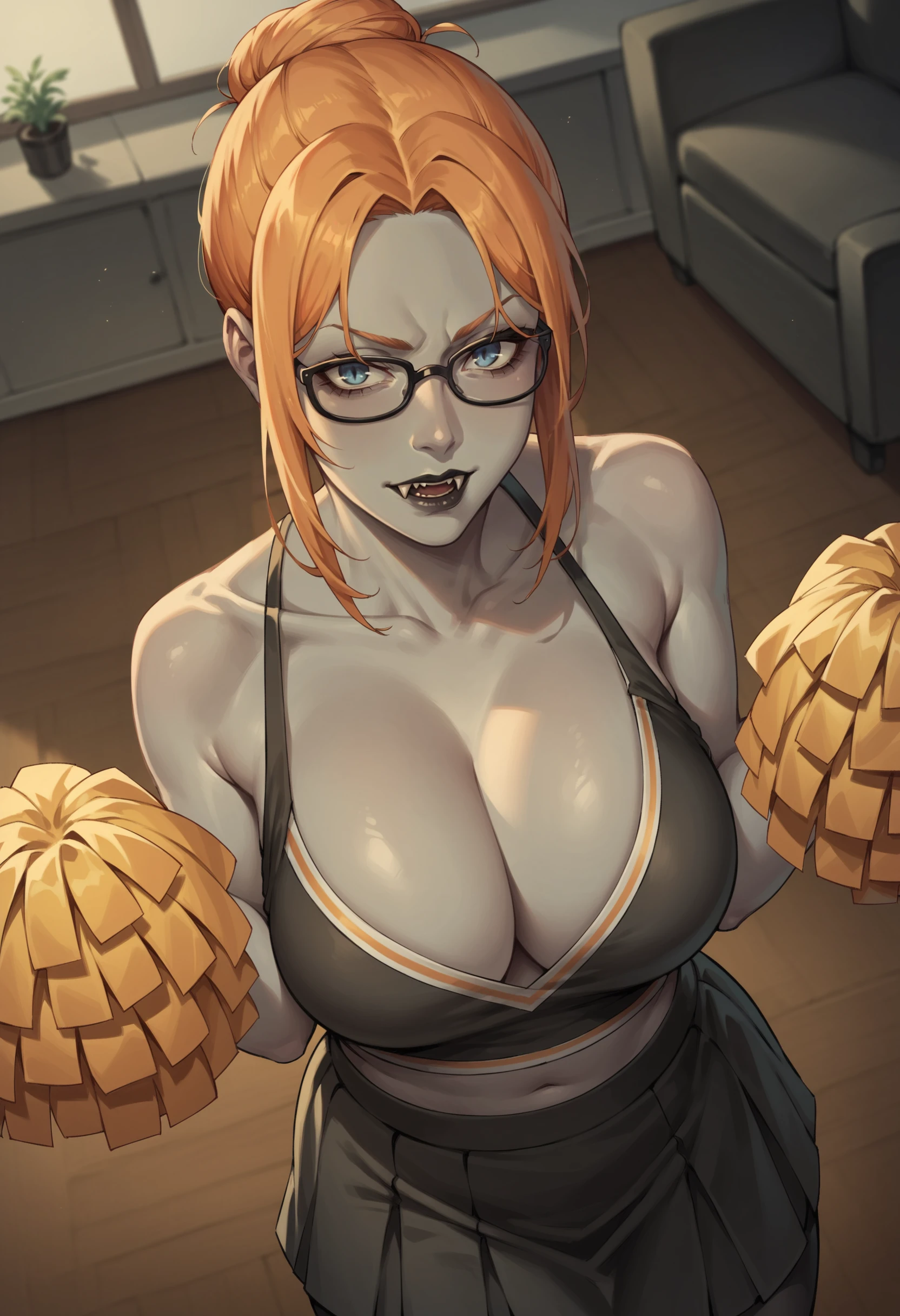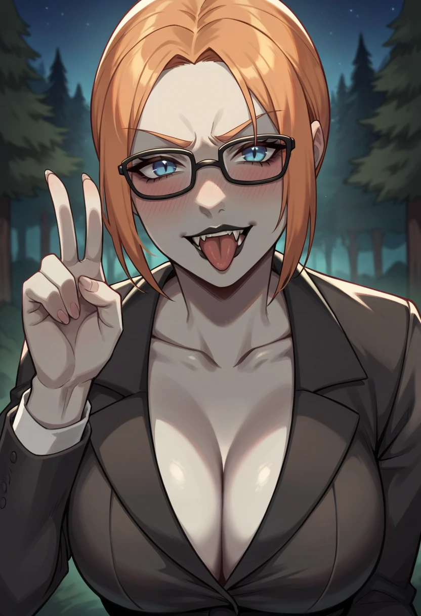 1girl, breasts, large breasts, cleavage, orange hair, blue eyes, black lips, small fangs