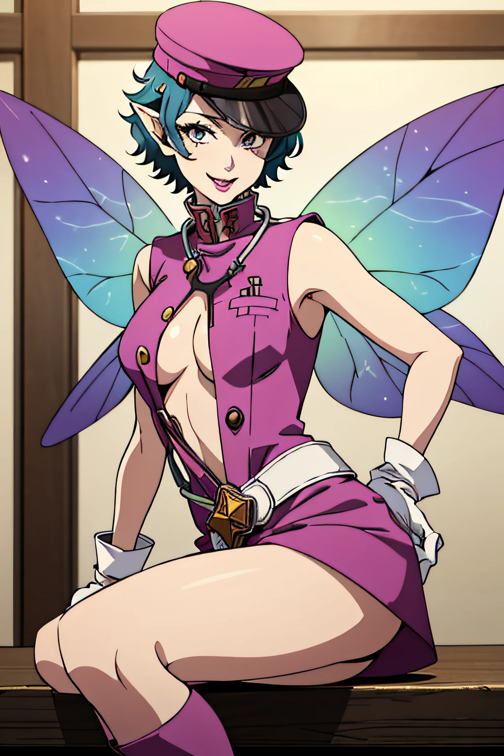 TRISHP2, HAT, SHORT HAIR, FAIRY WINGS, GLOVES, POINTY EARS, BLUE HAIR, BREASTS, LARGE BREASTS, WHITE GLOVES, CENTER OPENING, FACIAL MARK, LIPSTICK, KNEE BOOTS