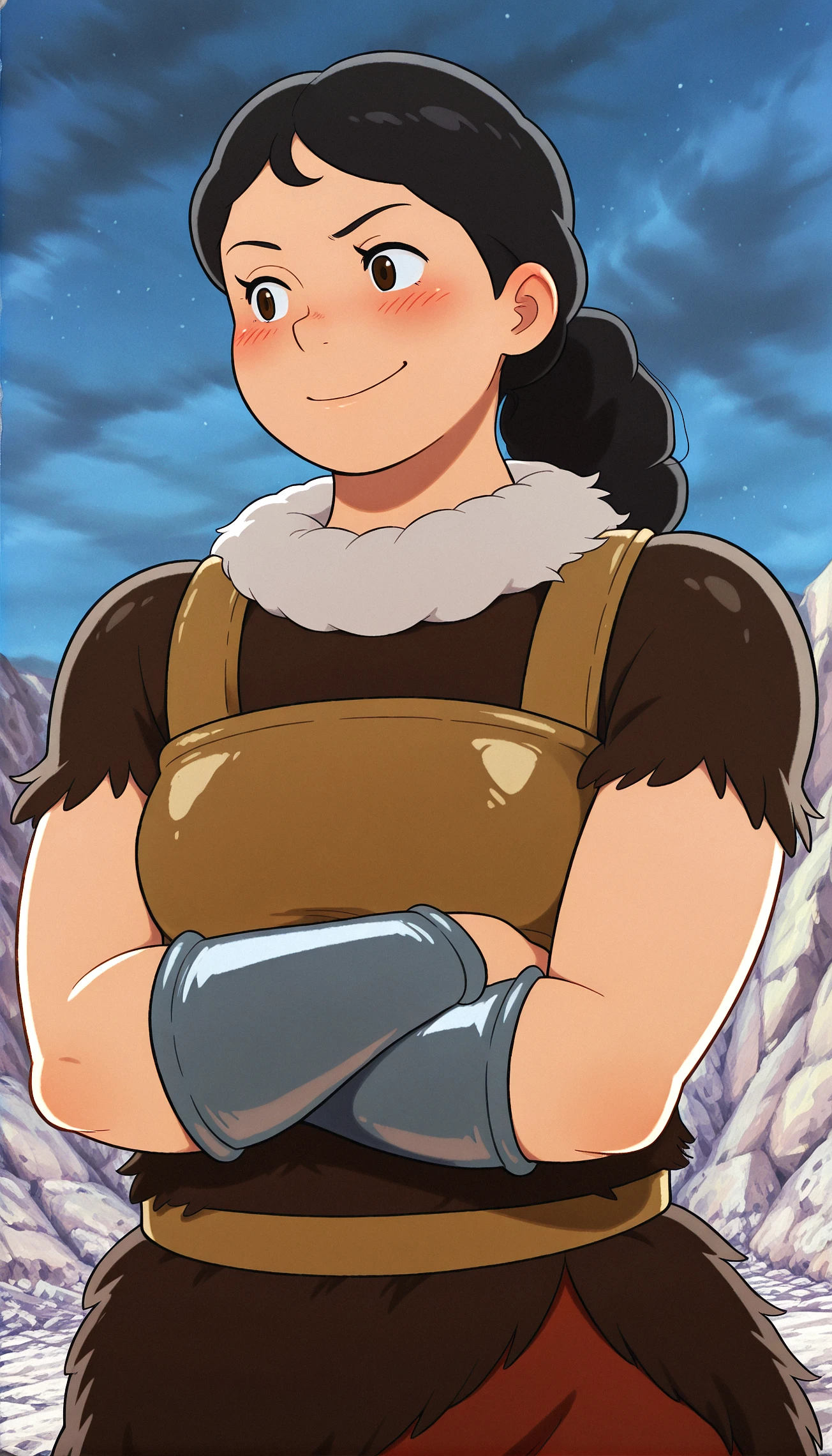 Seena, 1girl, solo, Giantess,black hair, padded leather armor, fur collar, short fur skirt, short sleeves, vambraces, (Additional for full body: short greaves, sandals)