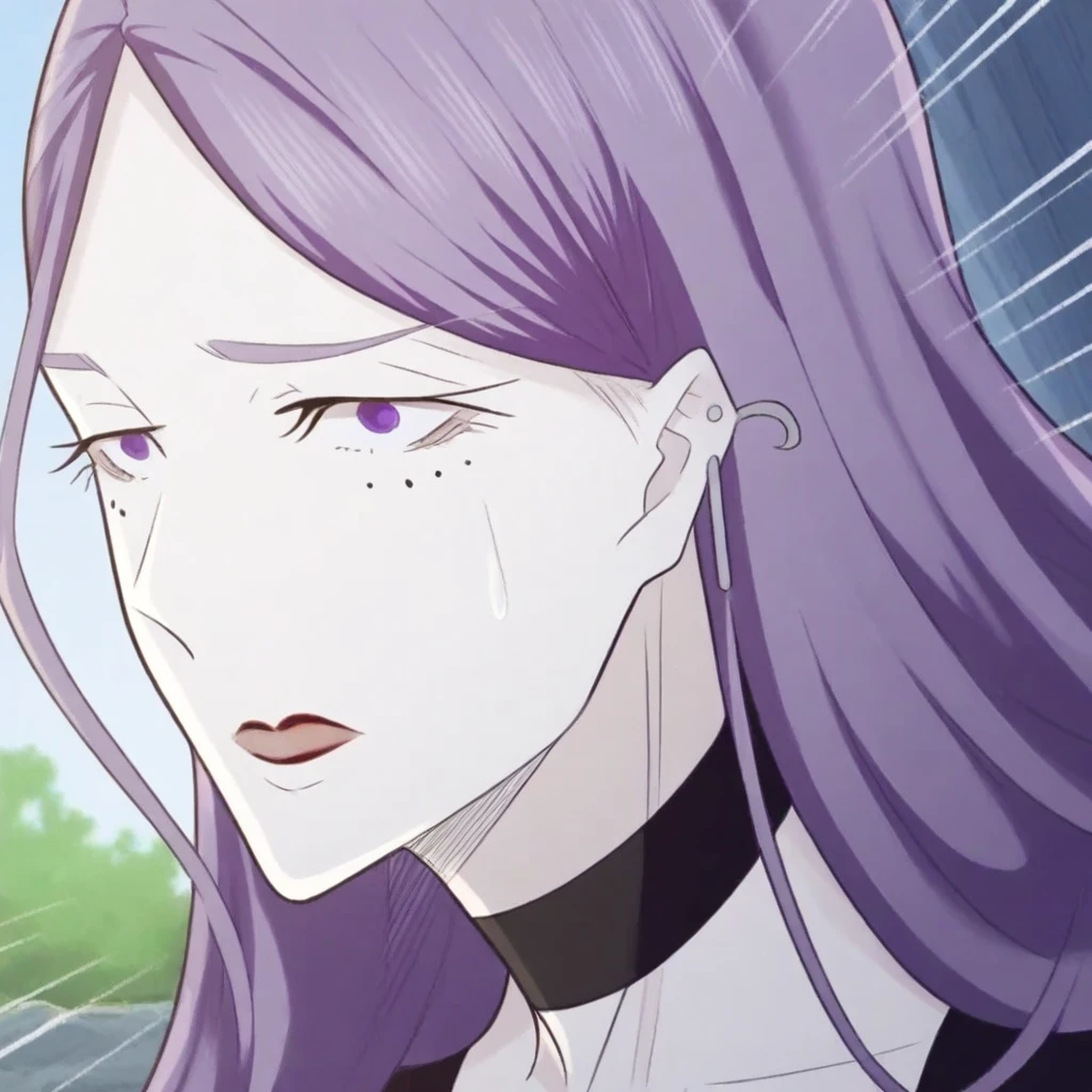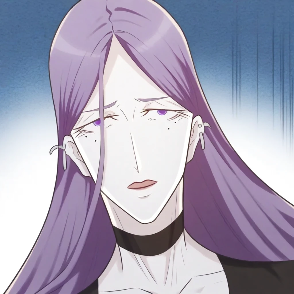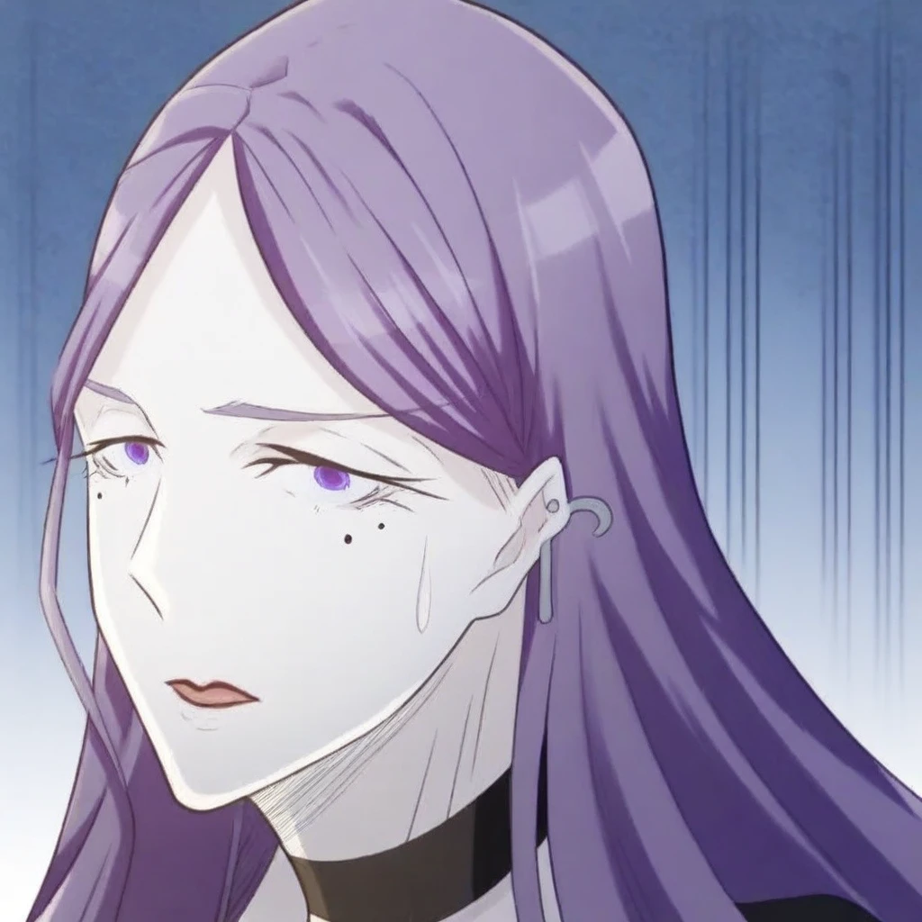 long hair, lavender-purple hair, purple eyes, mole under eyes