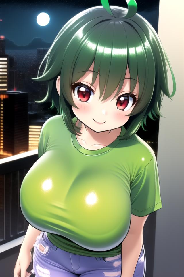 She always wears apple green tops and blue jeans. The length and thickness of these clothes change with the seasons. She also particularly likes apple and skull-shaped accessories and asymmetric shapes. In order to match her title "Green of Seven primary colors", and dyed his brown hair green.