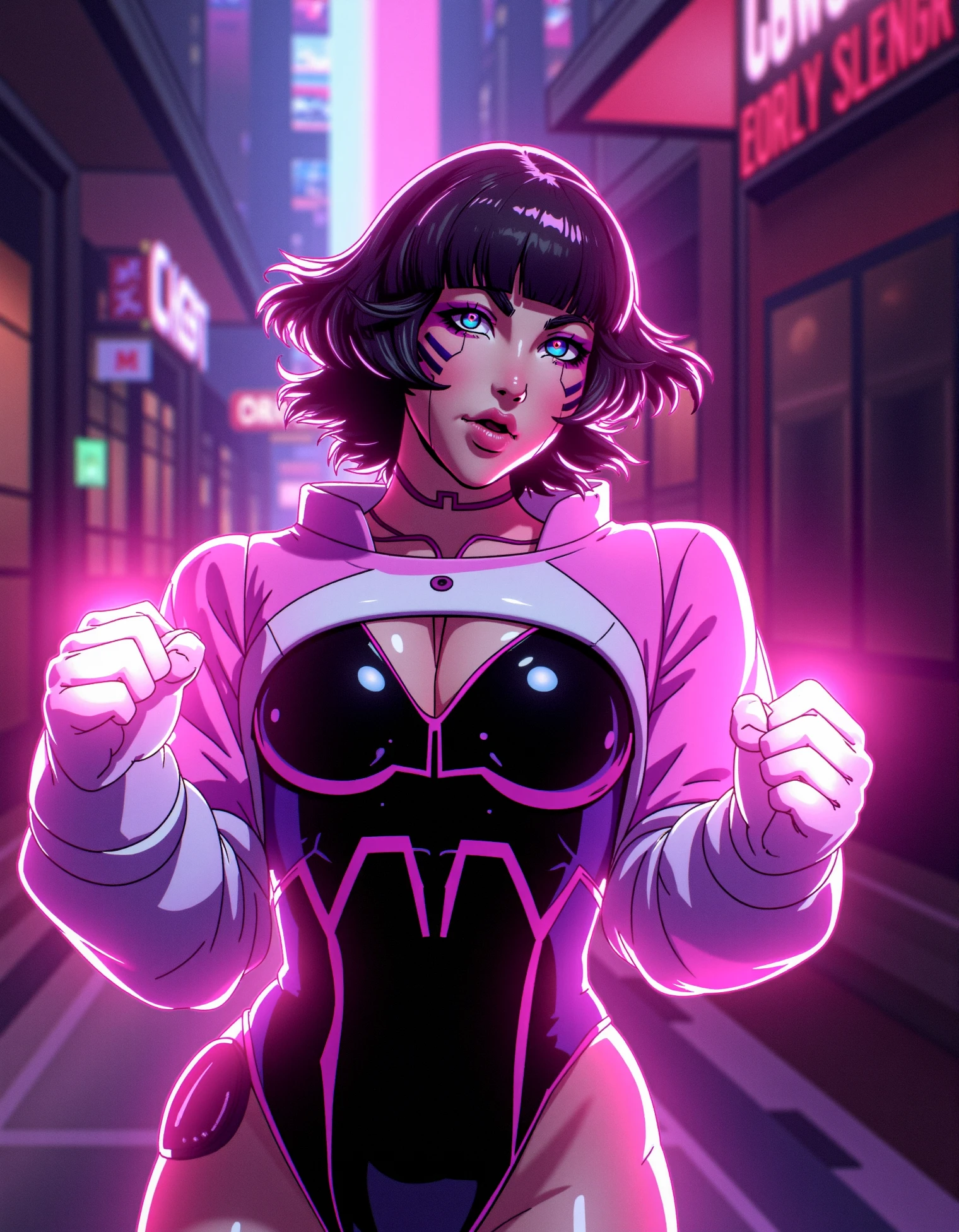 zavy-sasha, black bodysuit, pink with white shrugs, cyberpunk anime, neo-noir, neon lightRecommended settings