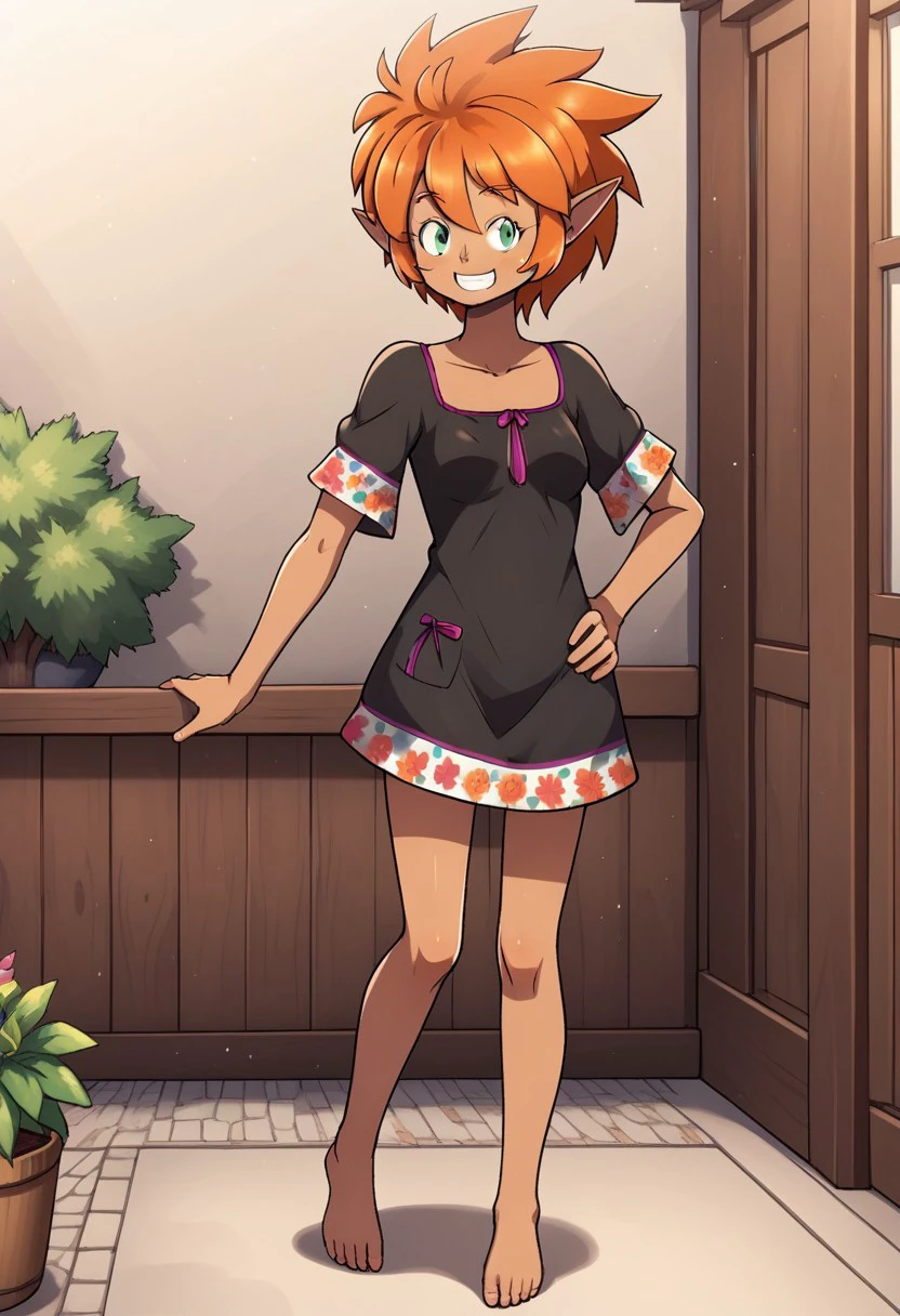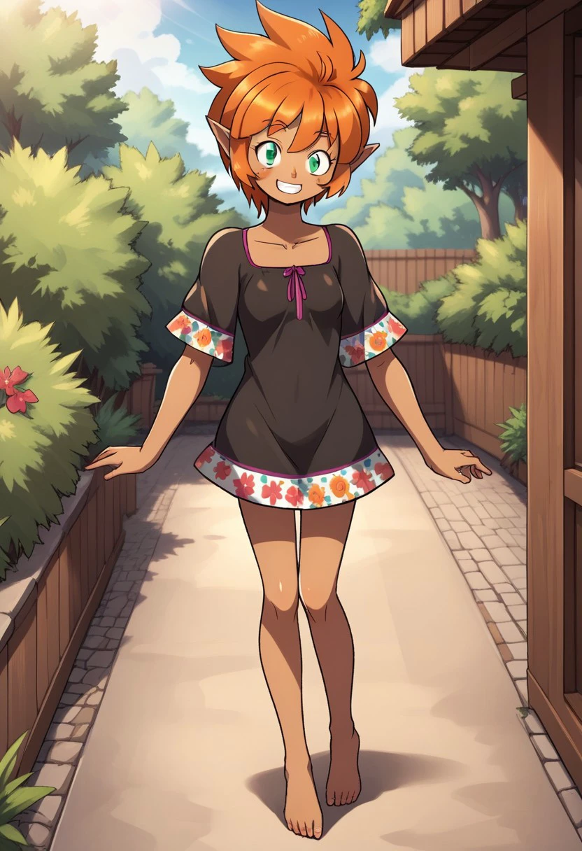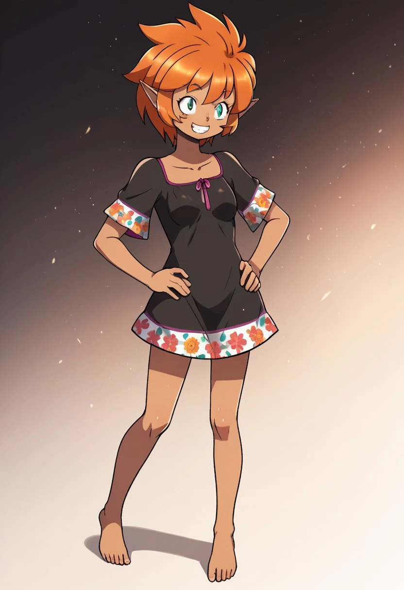 ixchel, 1girl. solo, dark skin, pointy ears, orange hair, green eyes, short hair, dress, floral print