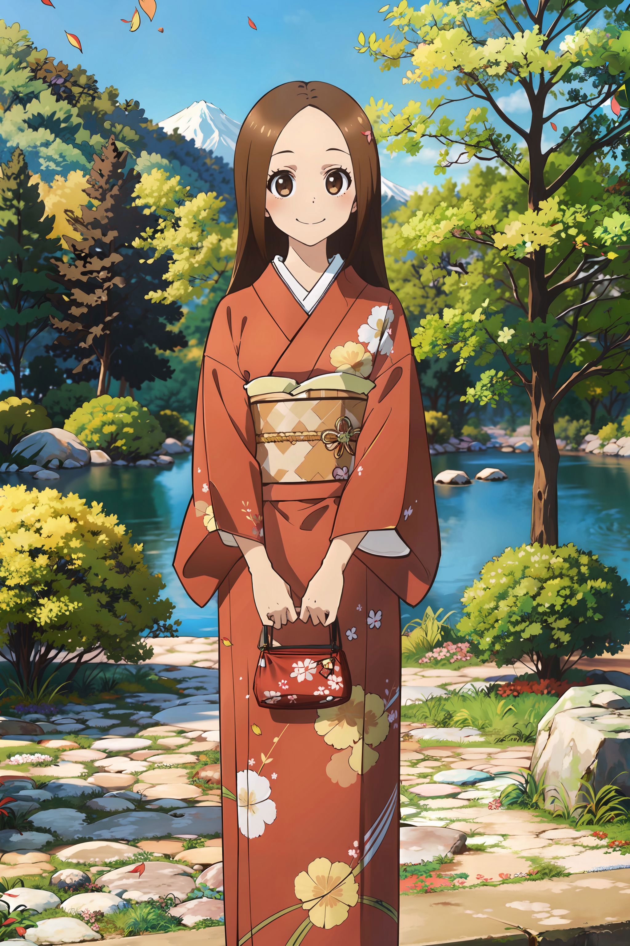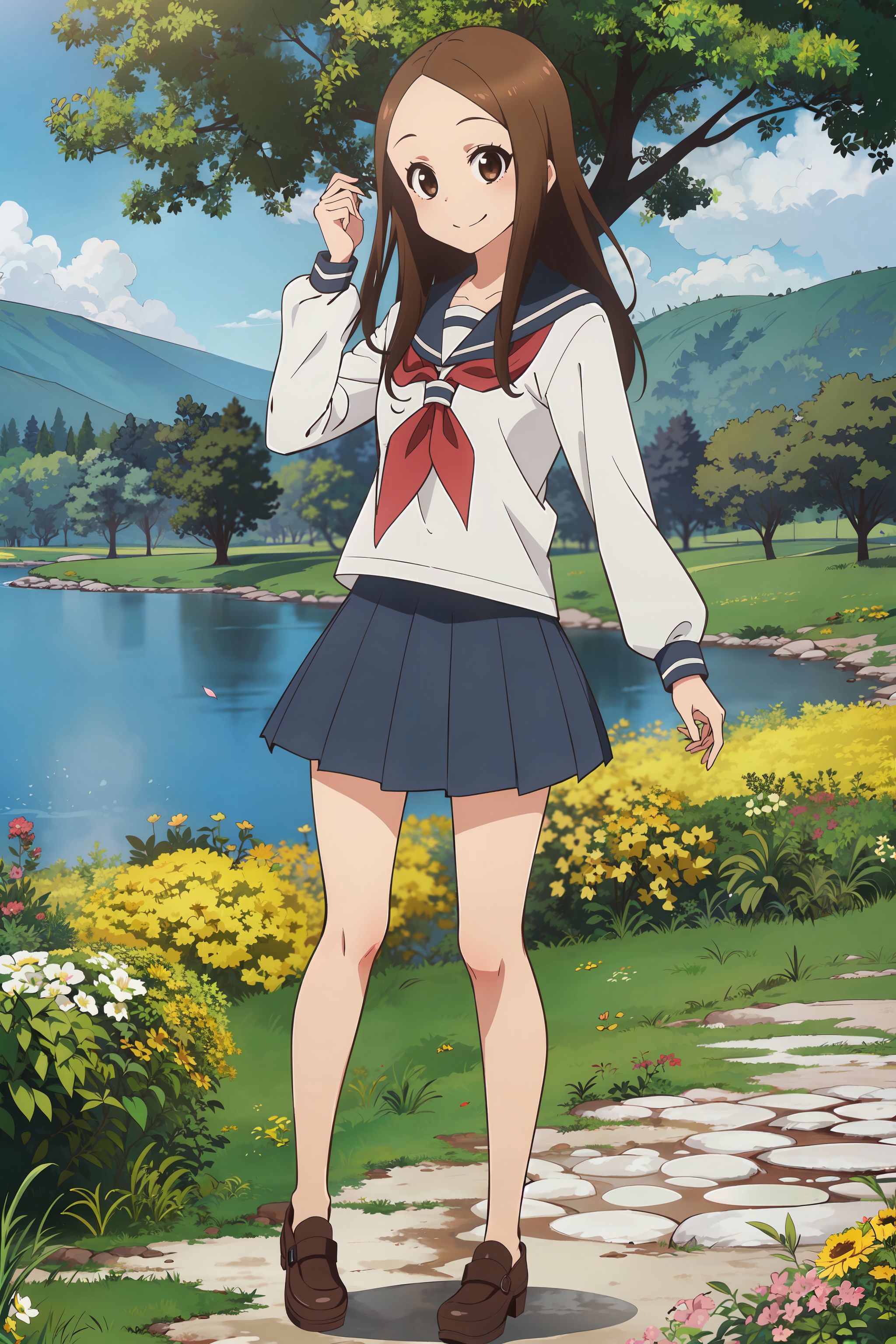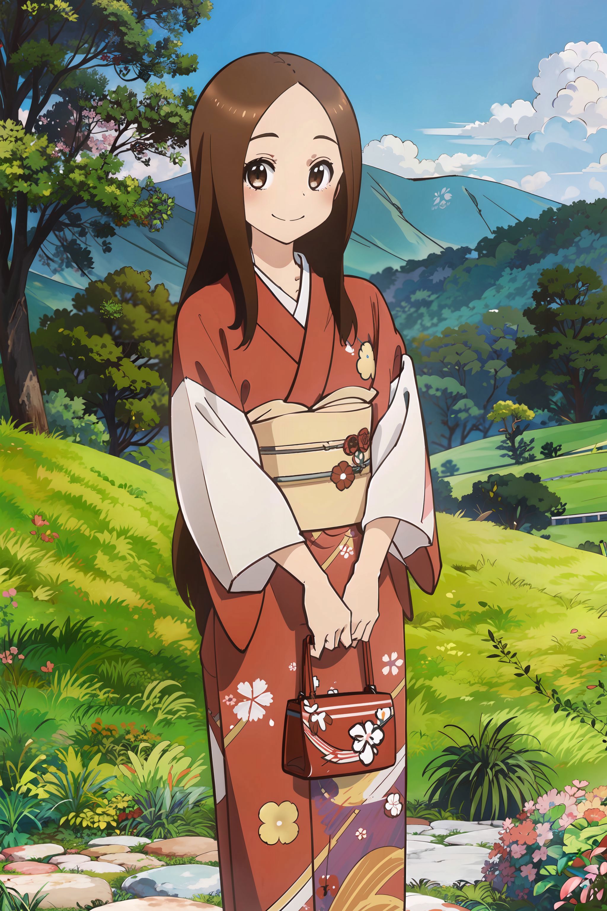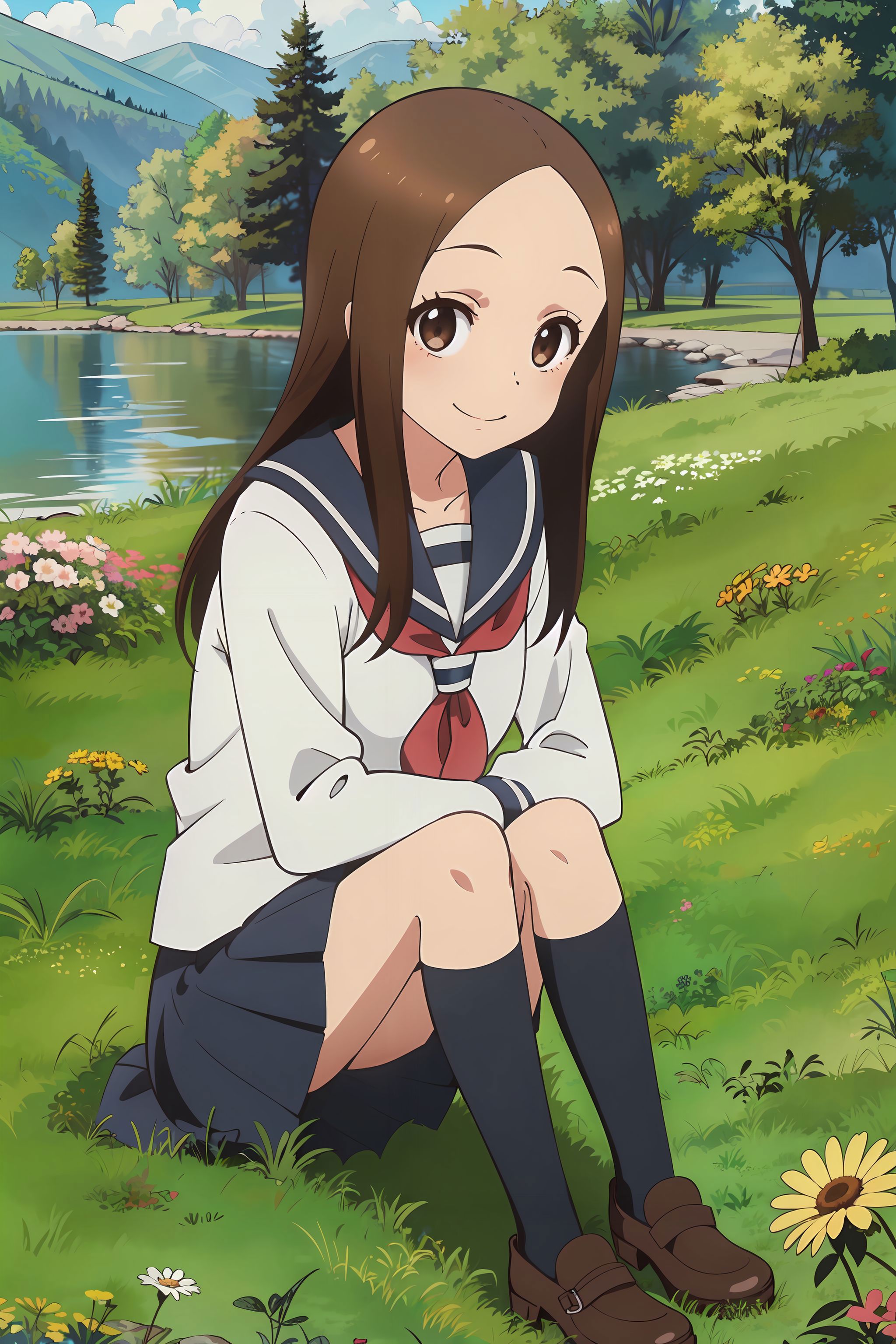 关键词:takagi_san, 1girl, brown hair, long hair, parted bangs, brown eyes, forehead