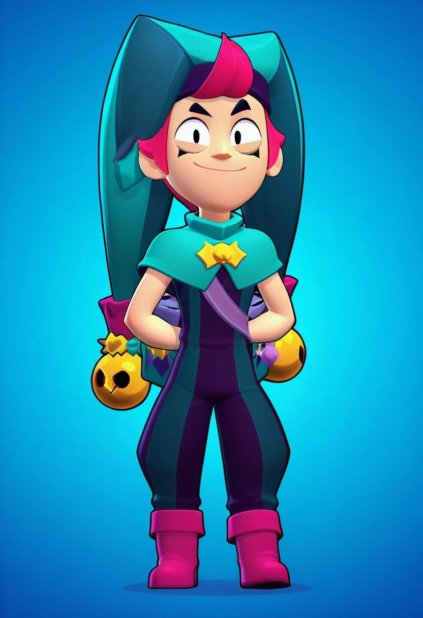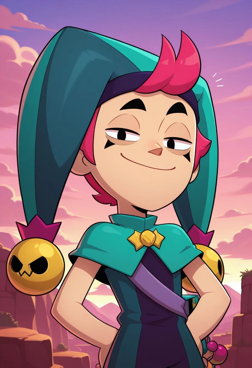 Chester_(BS), 1boy, solo, pink hair, black eyes, jester, jester hat, jester cap, jester hat with bells, facial mark