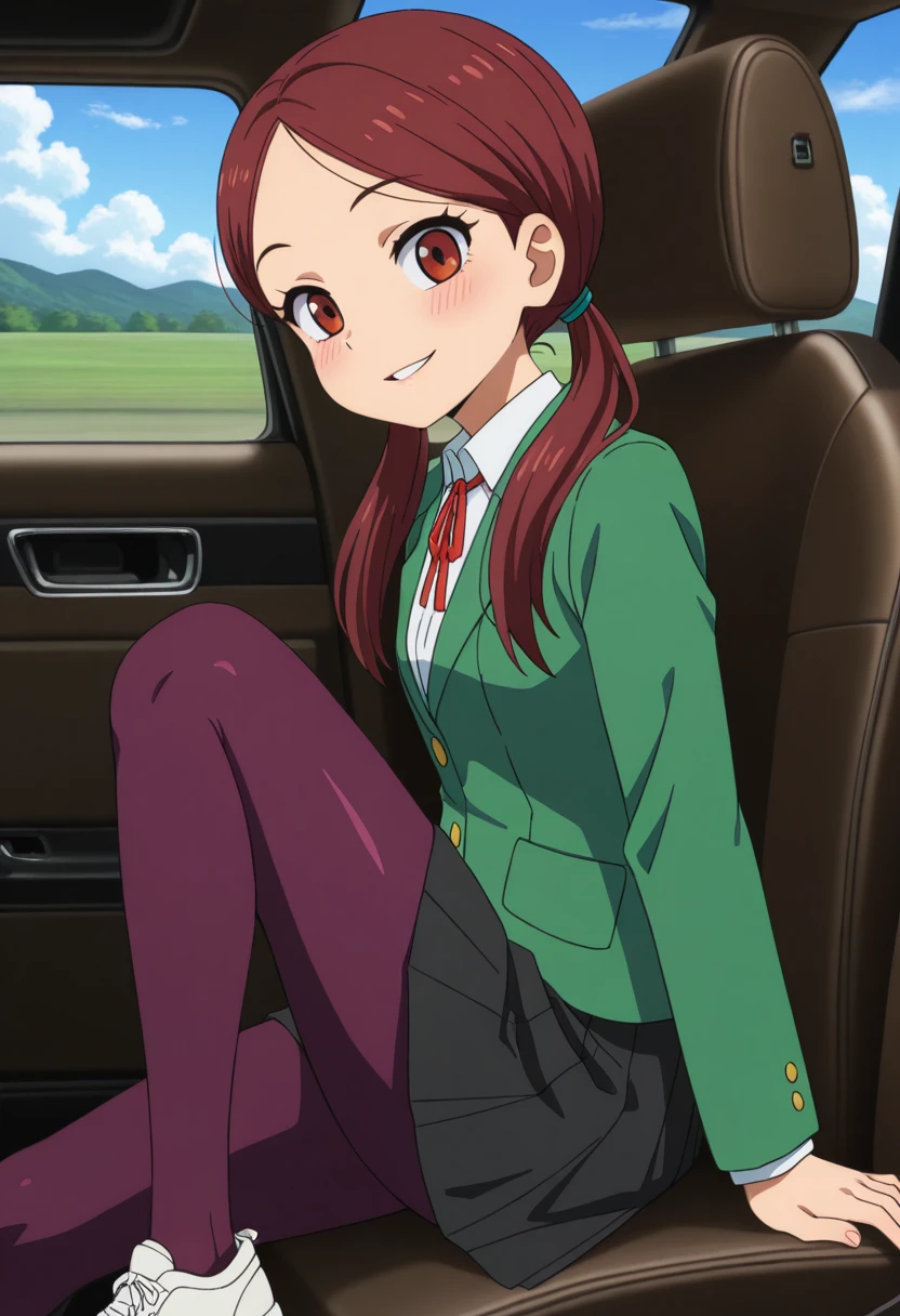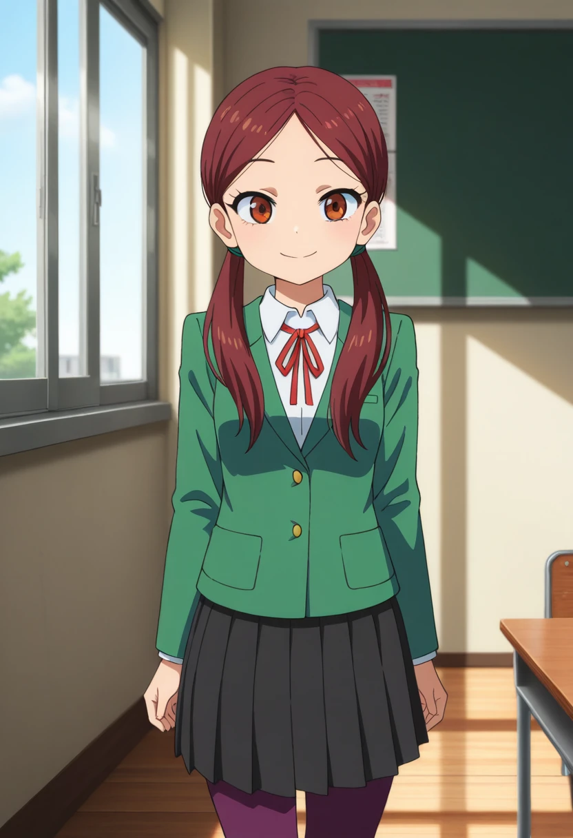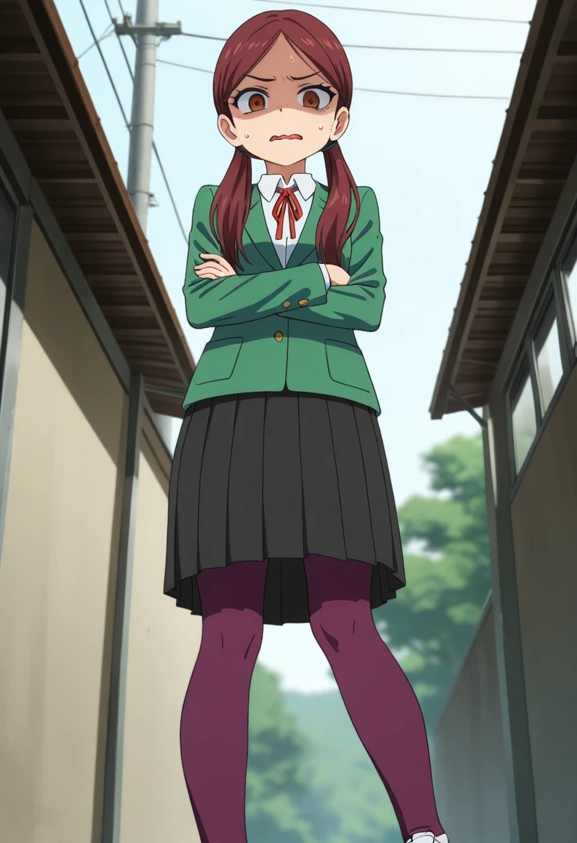 • school uniform, red neck ribbon, blazer, green jacket, white collared shirt, long sleeves, black pleated skirt, medium skirt, purple pantyhose, sneakers,