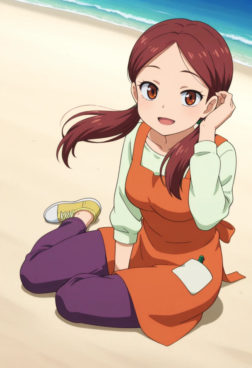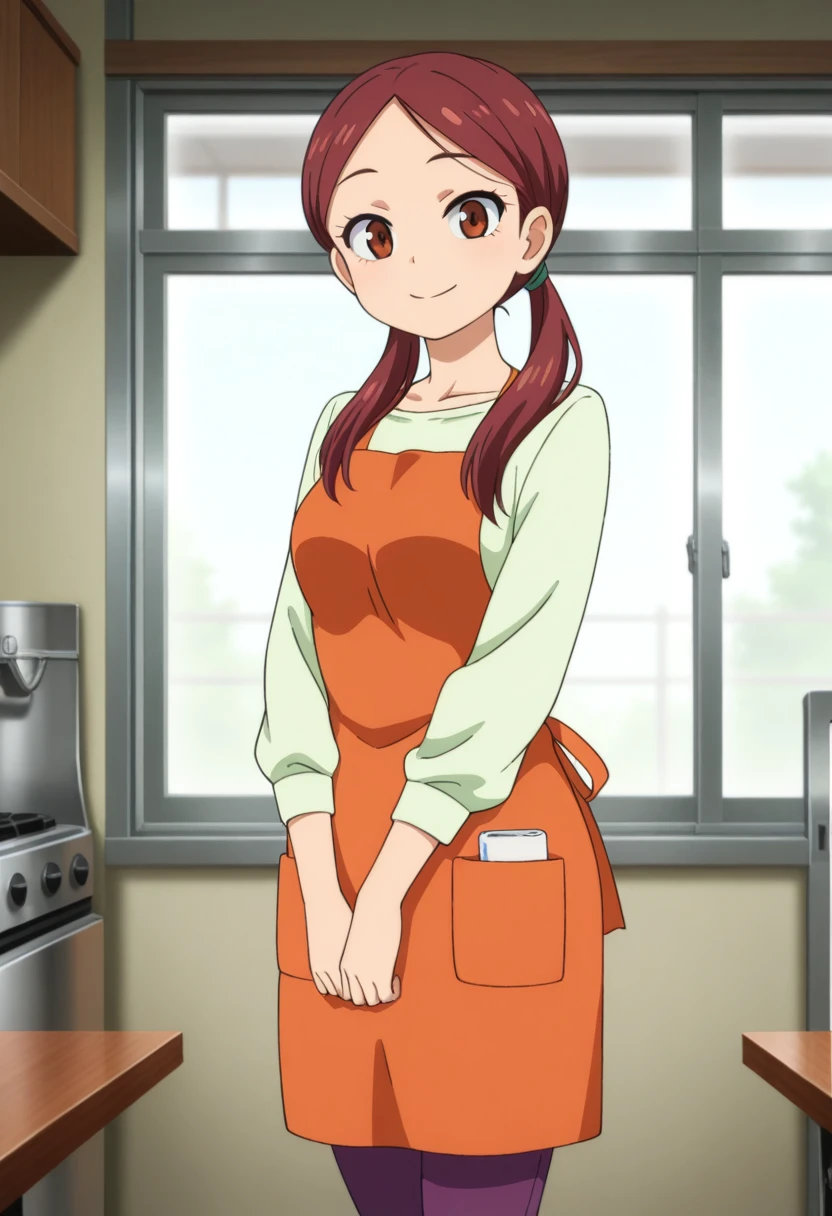 light green shirt, orange apron, three-quarter sleeves, purple pants, shoes,