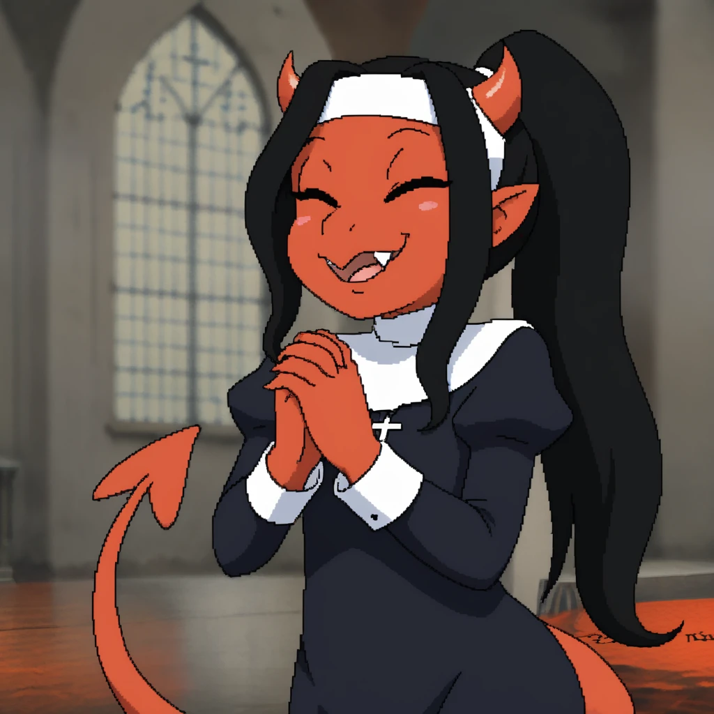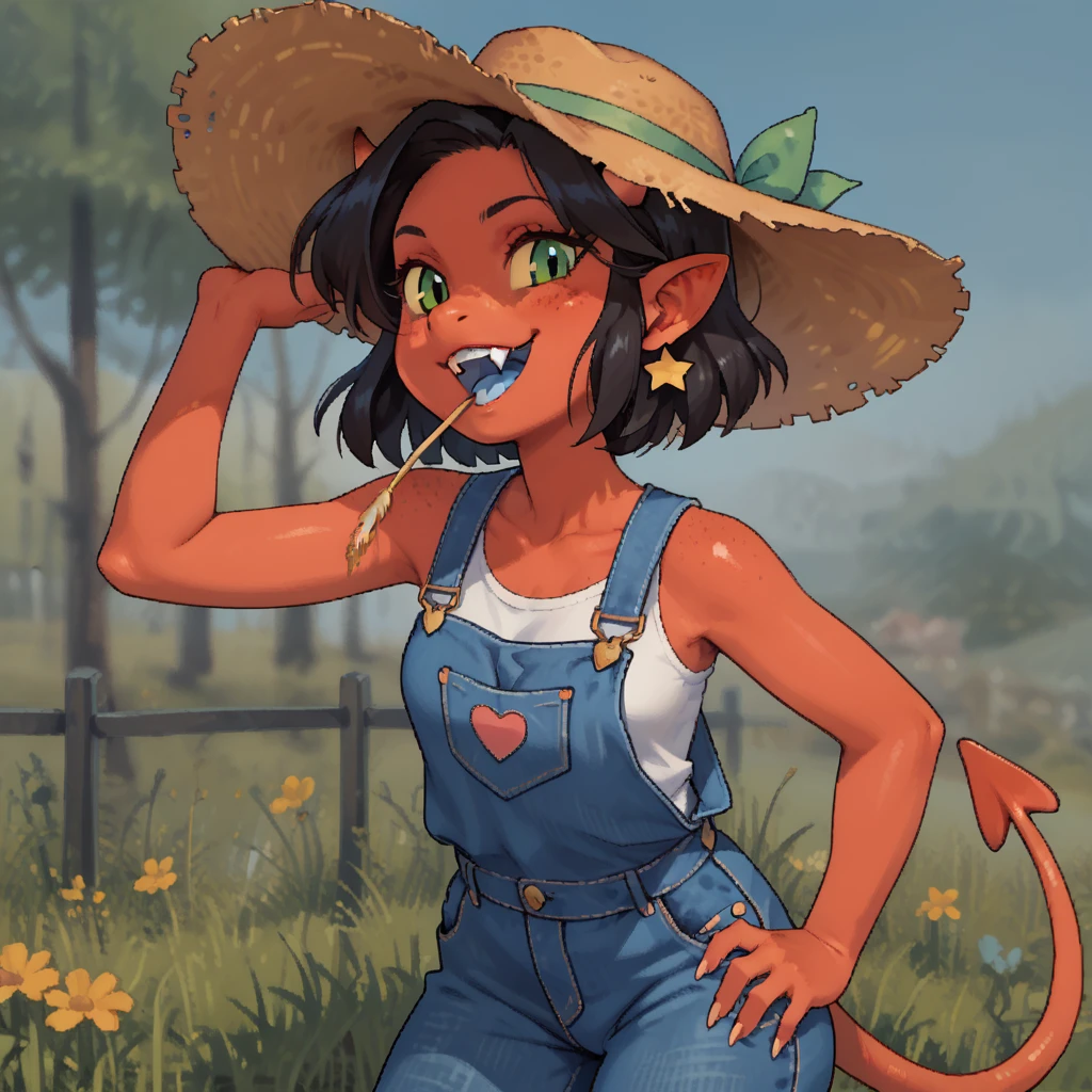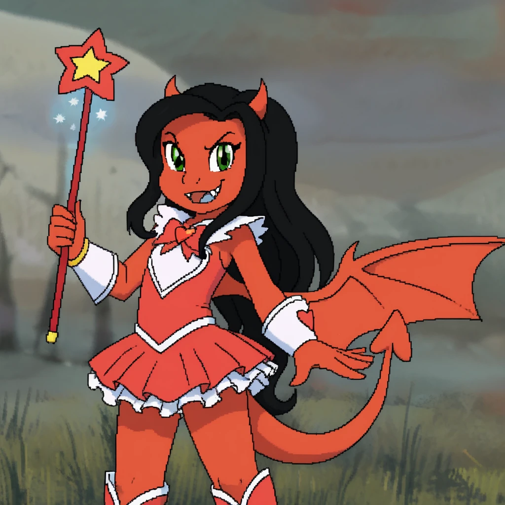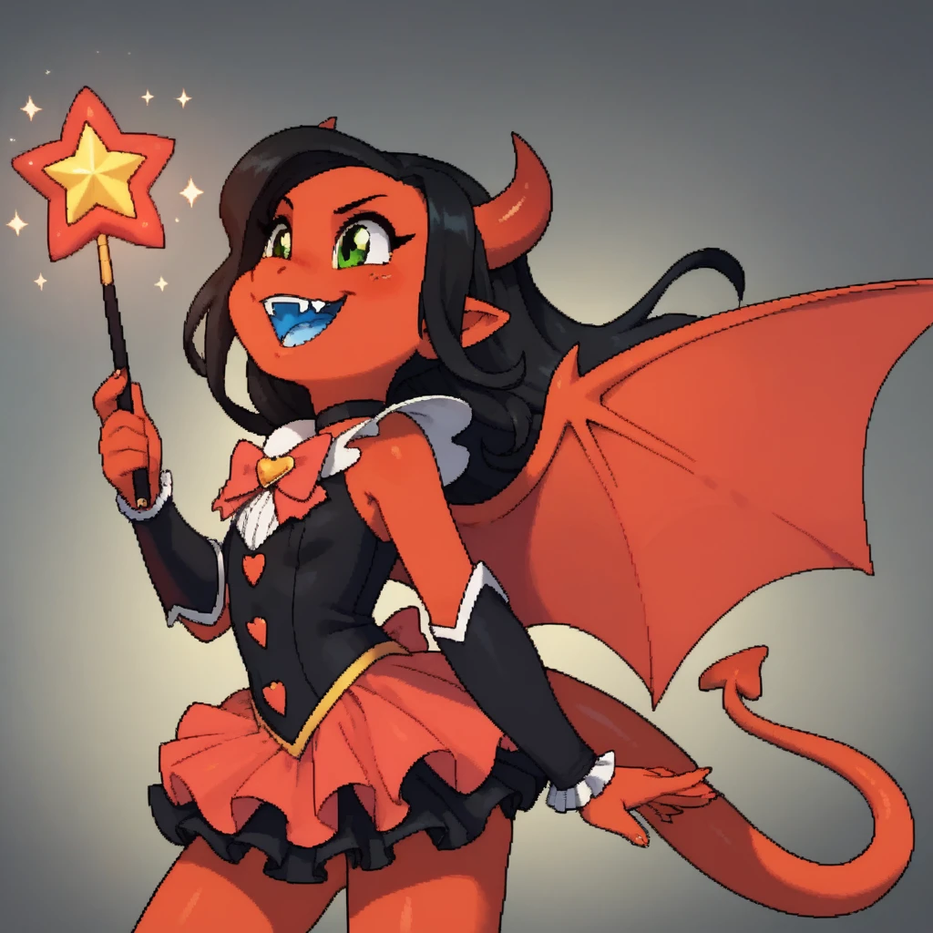 Appearance: red skin, demon tail, snout, horns, long hair, black hair, fang, blue mouth,