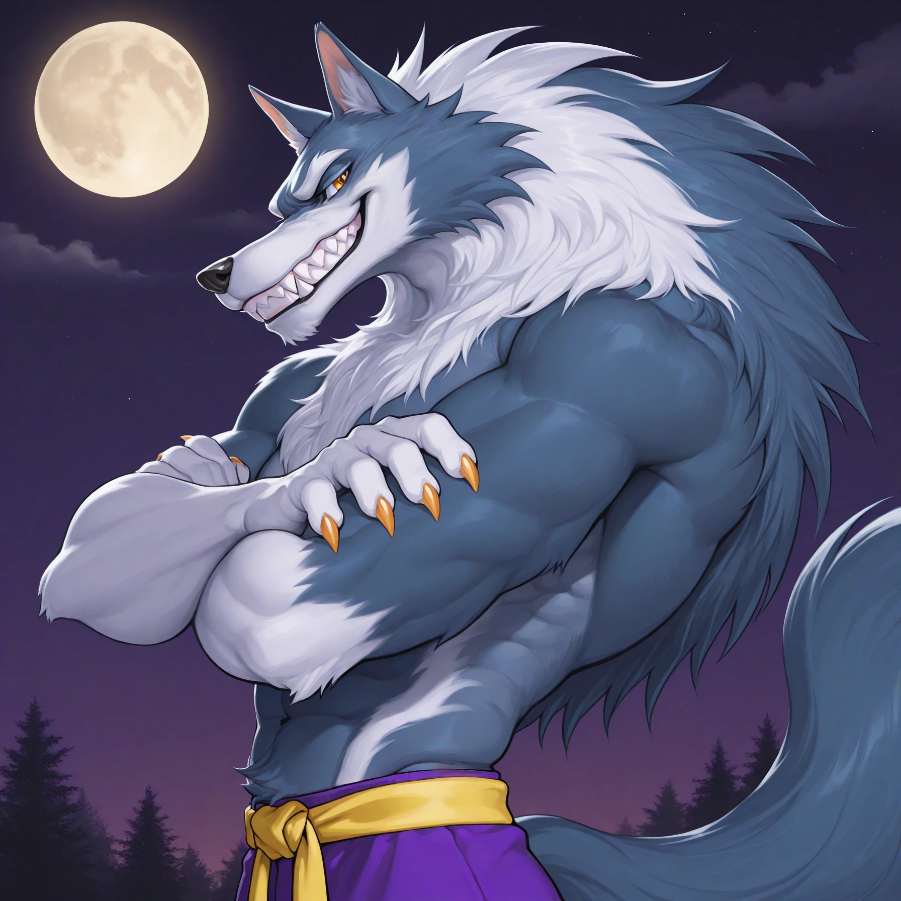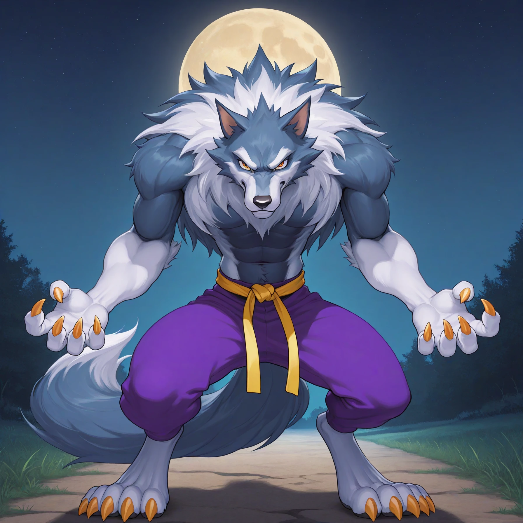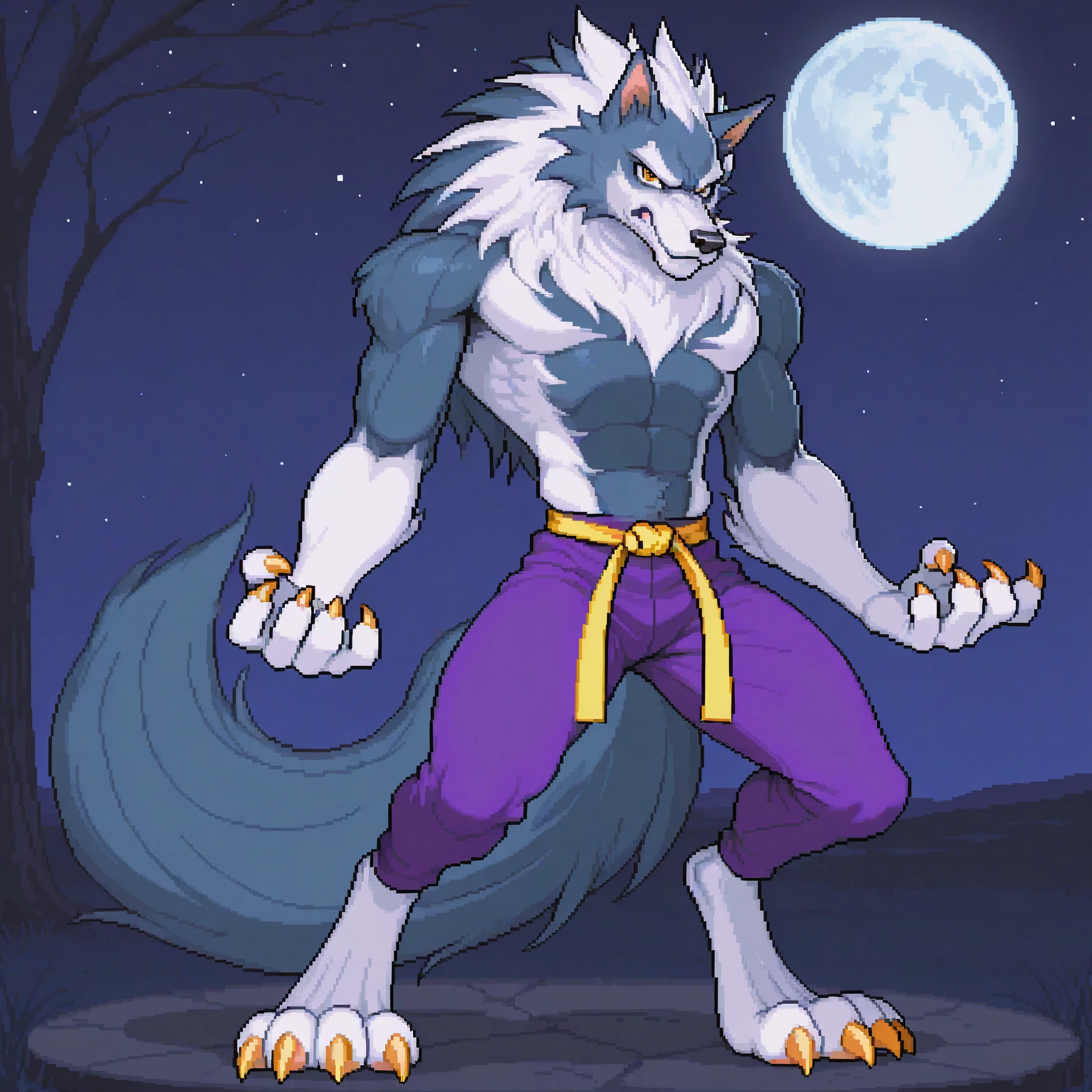 jtdsv, jon talbain, werewolf, muscular, wolf boy, orange eyes, sharp teeth, fangs, multicolored fur, blue fur, white fur, wolf ears, claws, animal hands, wolf tail, animal feet, purple pants, yellow martial arts belt