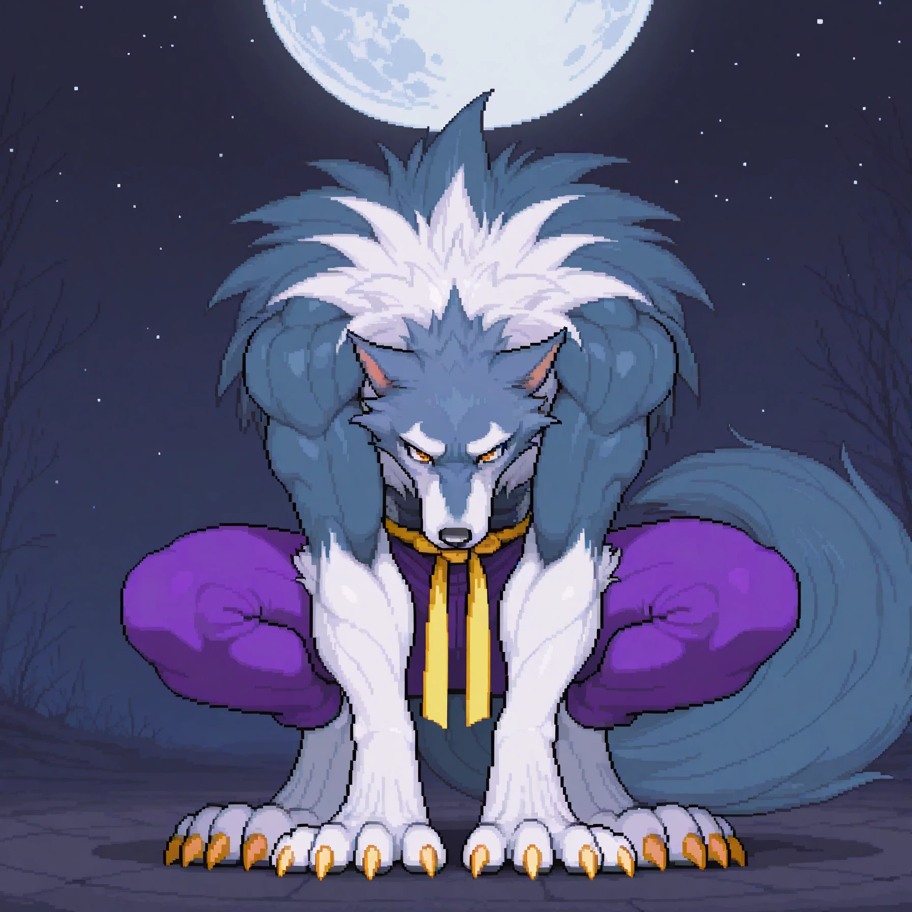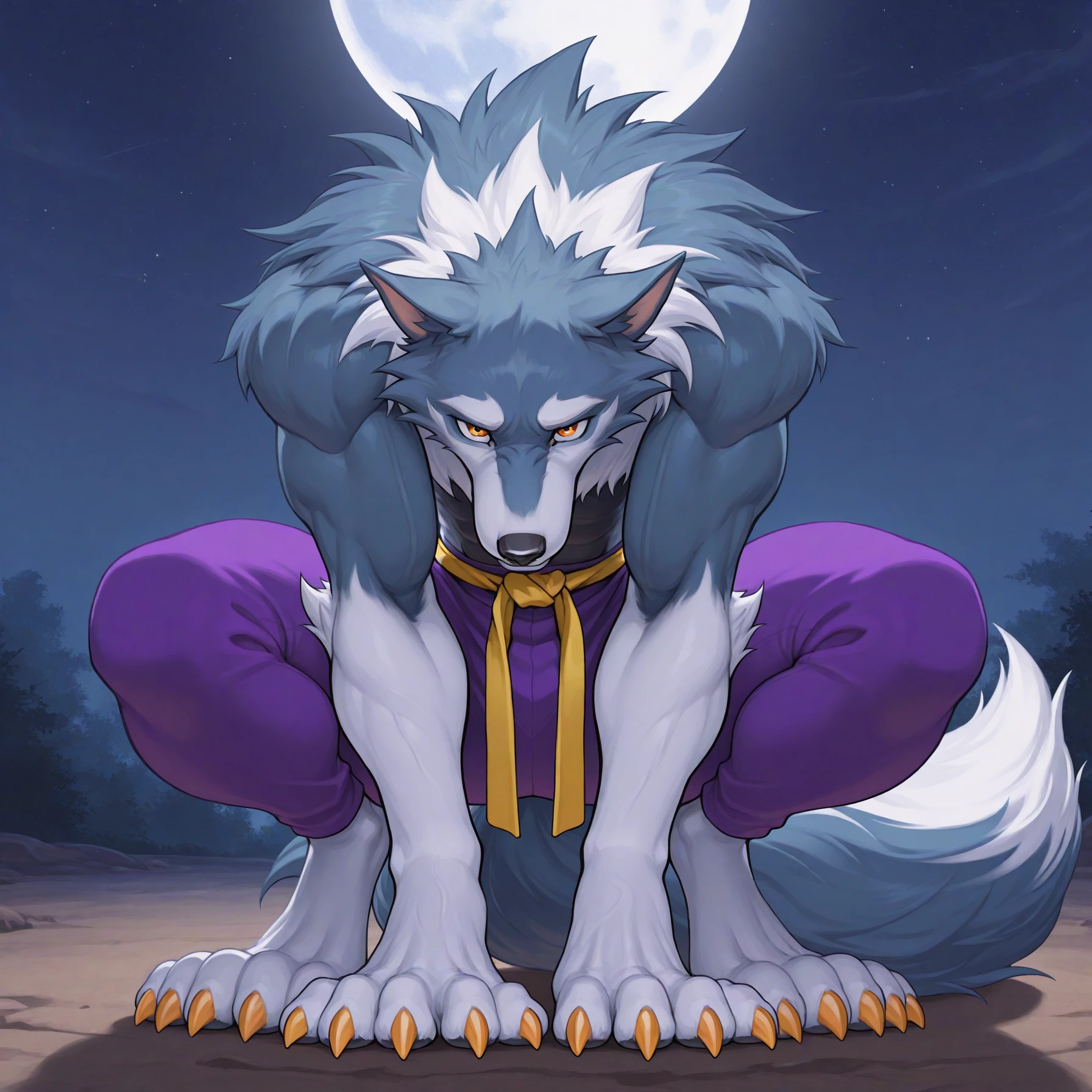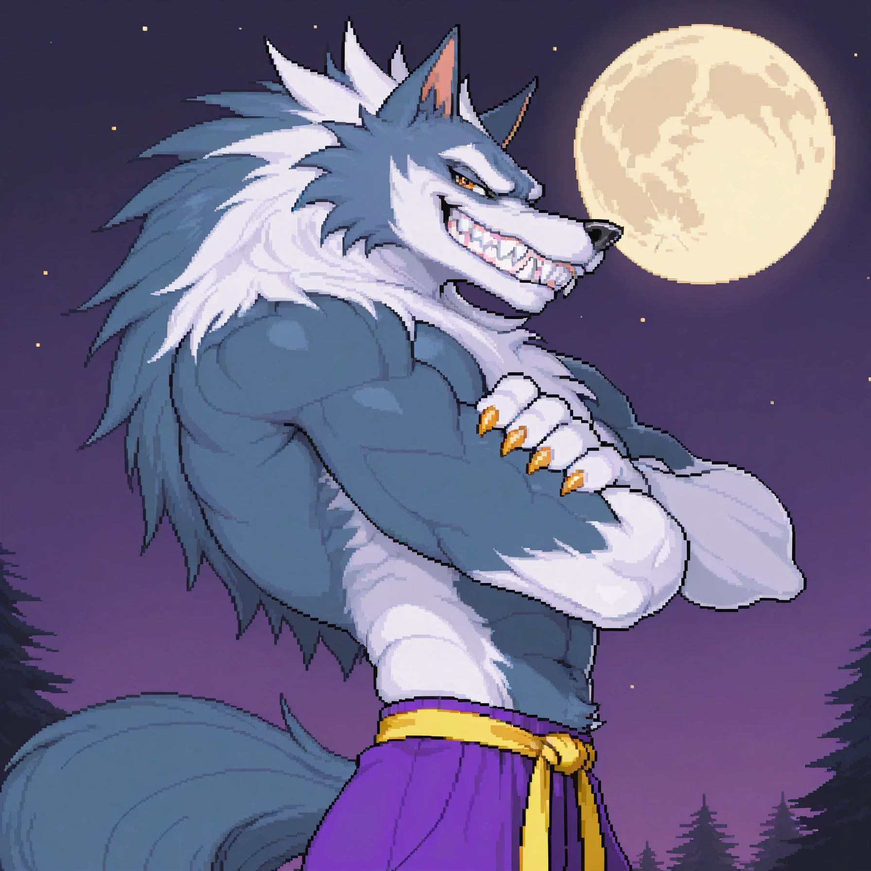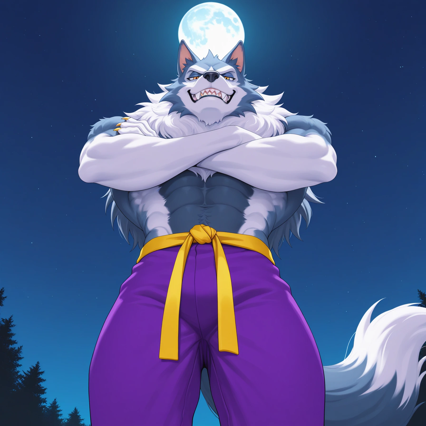 jtdsv, jon talbain, werewolf, muscular, wolf boy, orange eyes, sharp teeth, fangs, multicolored fur, blue fur, white fur, wolf ears, claws, animal hands, wolf tail, animal feet, purple pants, yellow martial arts belt