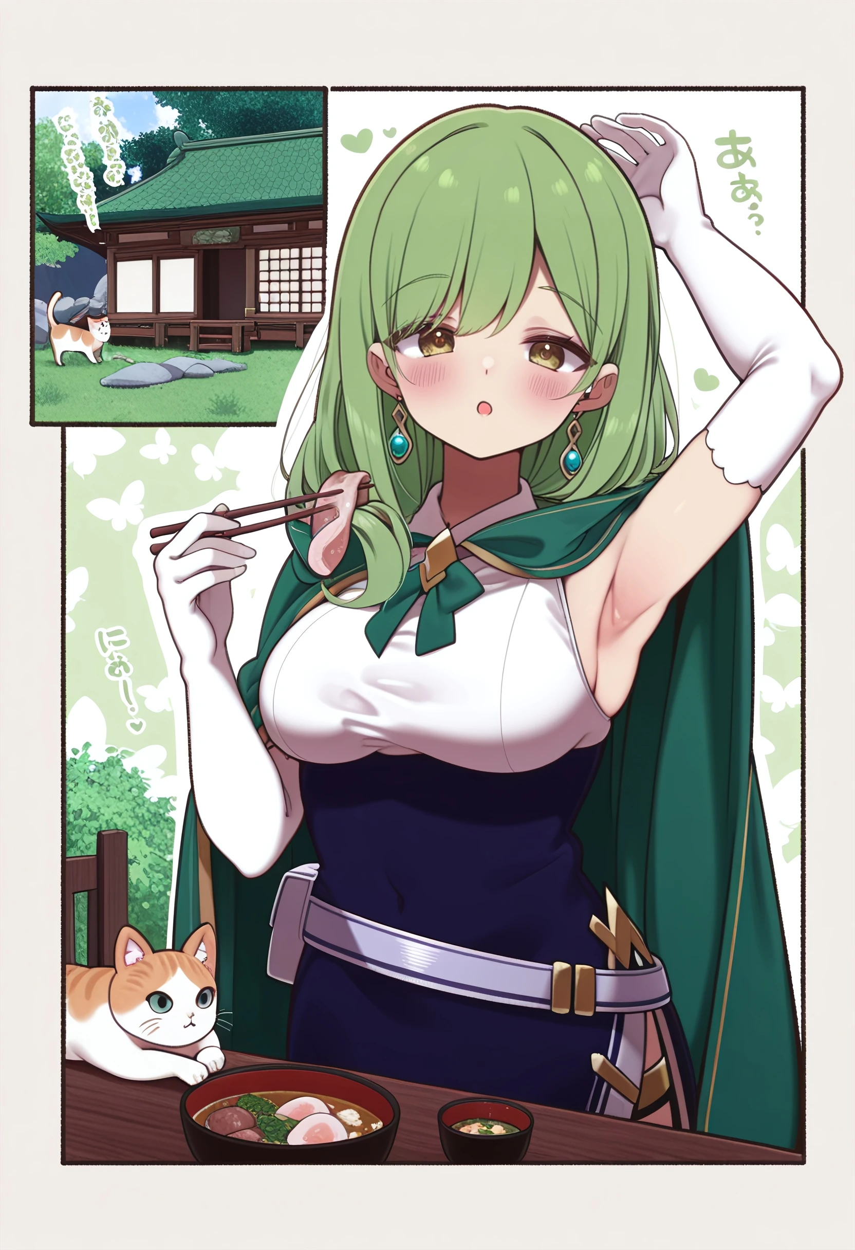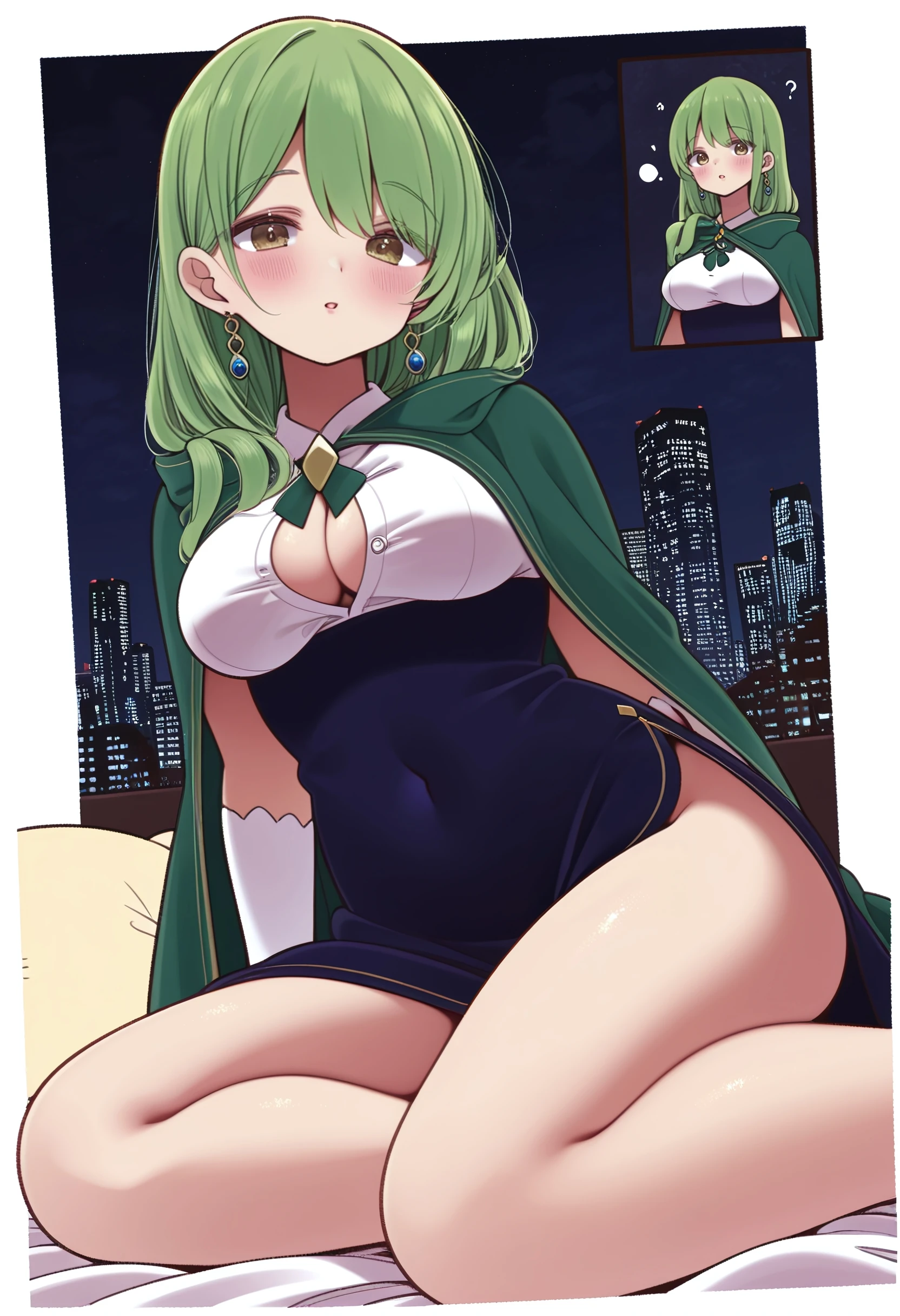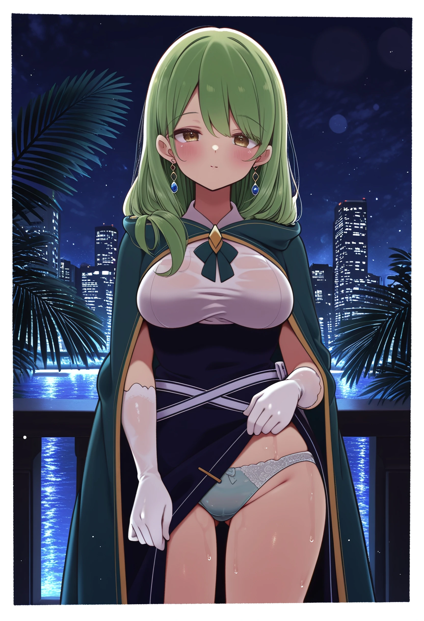 filly_carpenter, long_hair, green_hair, hair_over_shoulder, swept_bangs, earrings, brown_eyes, yellow_eyes, medium_breasts, hood_down, hooded_cloak, green_cloak, white_shirt, collared_shirt, white_gloves, elbow_gloves, two-tone_dress, blue_dress, side_slit