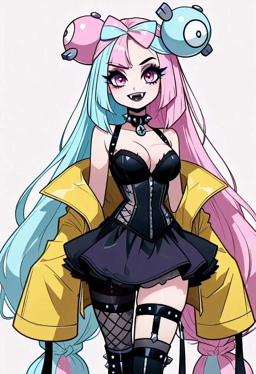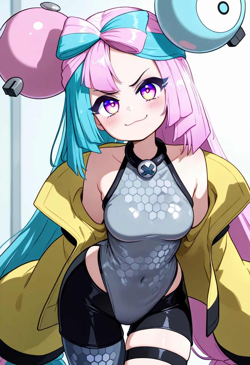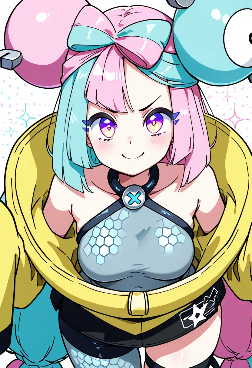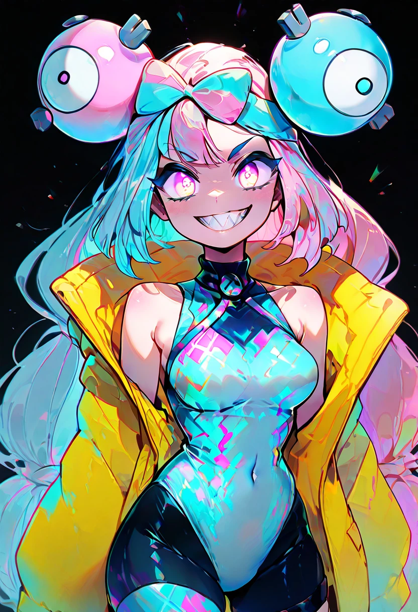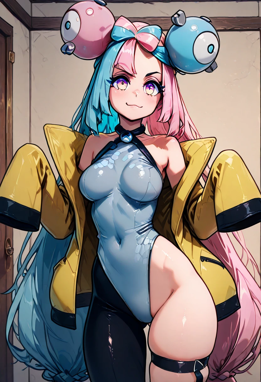 zzIono, solo, 1girl, long hair, pink eyes, blue hair, pink hair, light blue hair, multicolored hair, bow-shaped hair, yellow jacket, sleeves past fingers, single leg pantyhose, thigh strap,