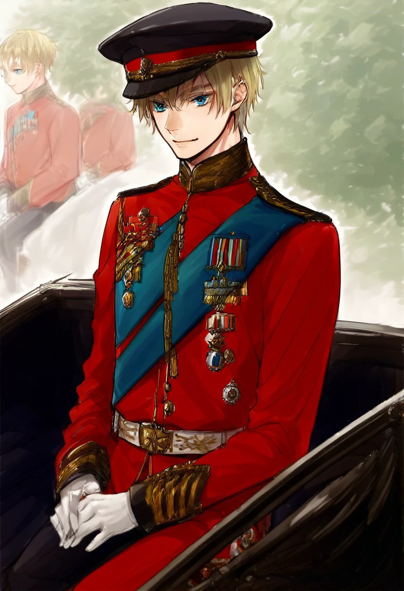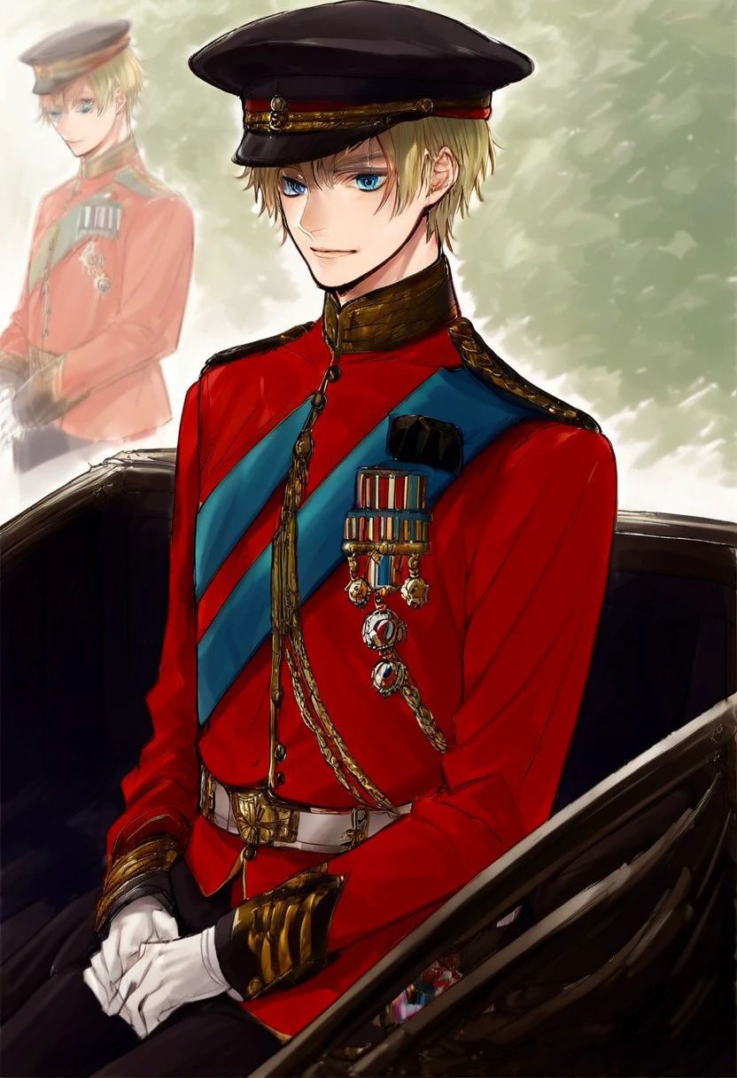 gloves, 1boy, military medal, male focus, military, hat, Military outfit, Sitting on a carriage,Military uniform