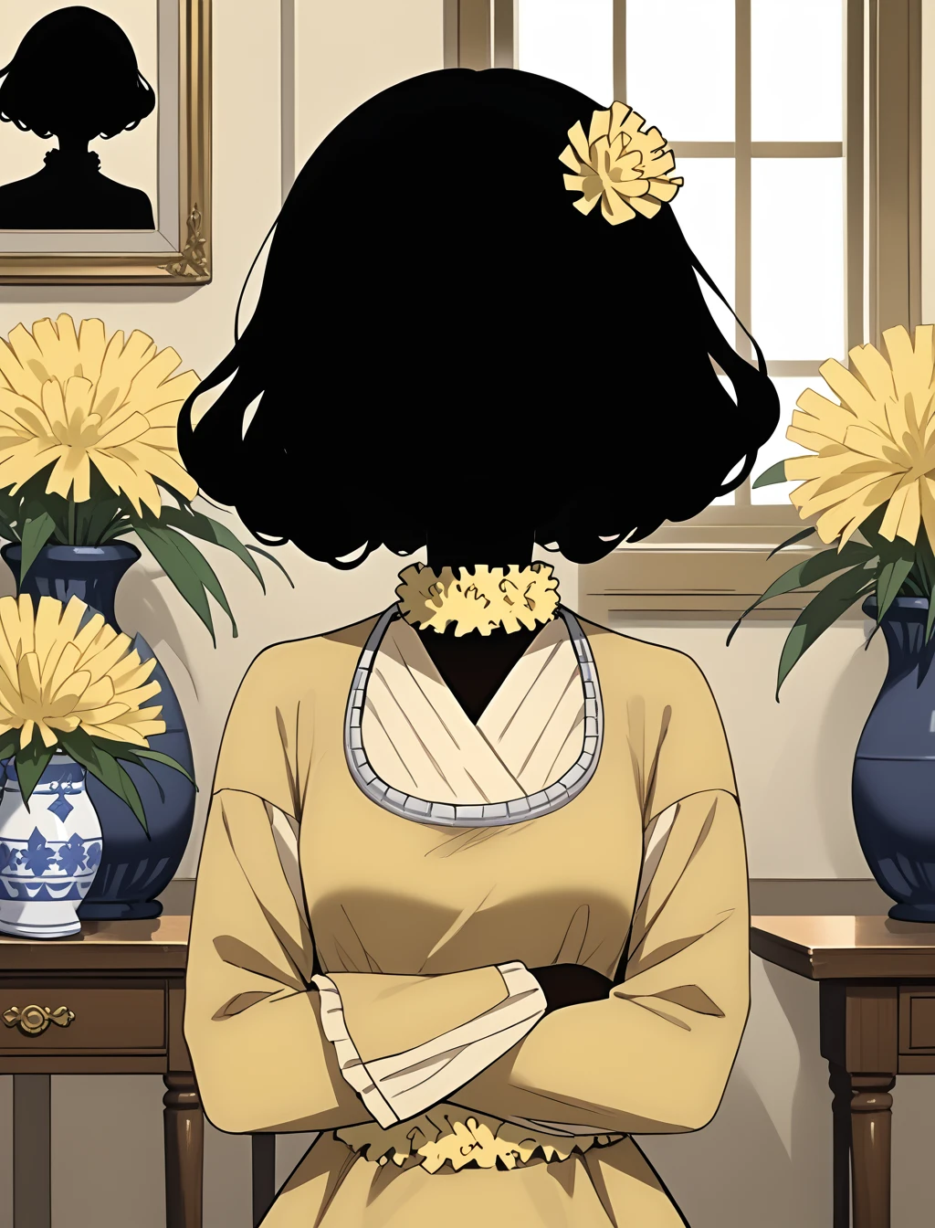 belt, yellow dress, hair flower, yellow flower, necklace, frilled dress