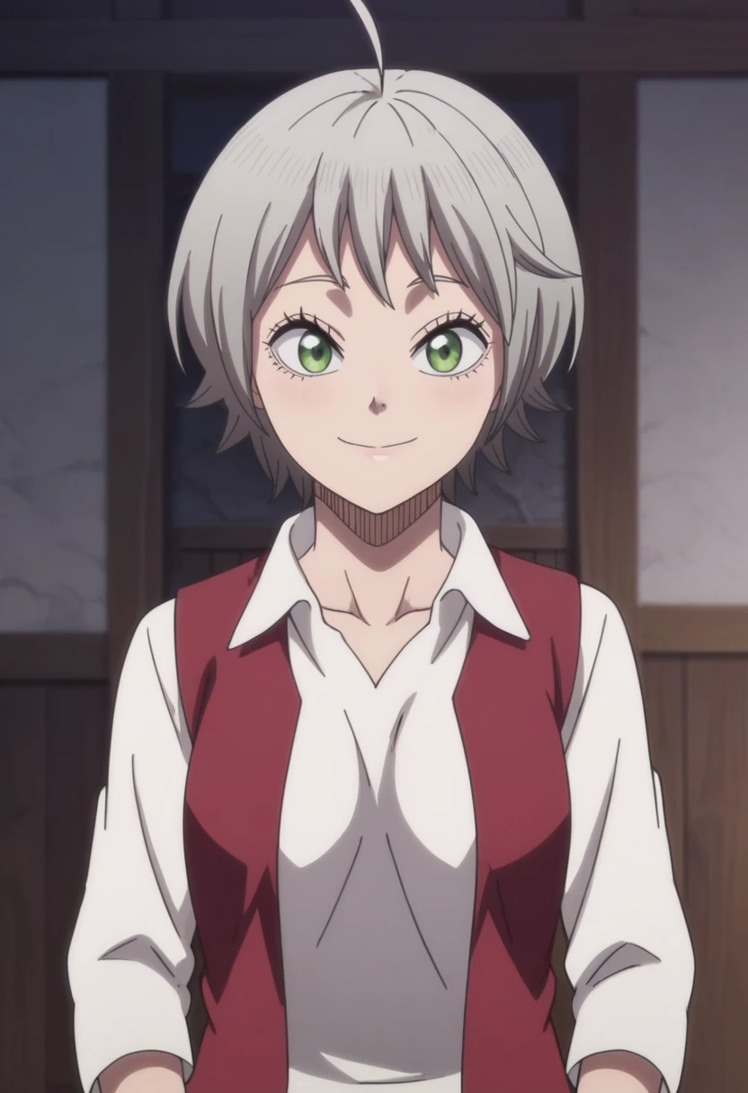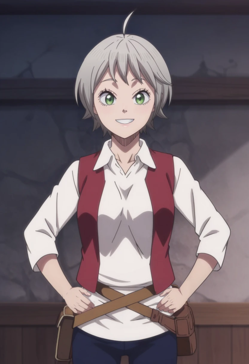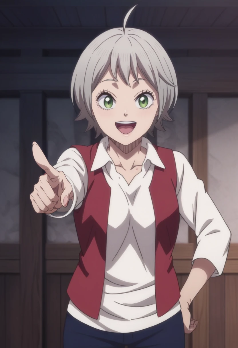 richita, 1girl, green eyes, short hair, ahoge, grey hair, white shirt, red vest, blue pants, hip pouch,