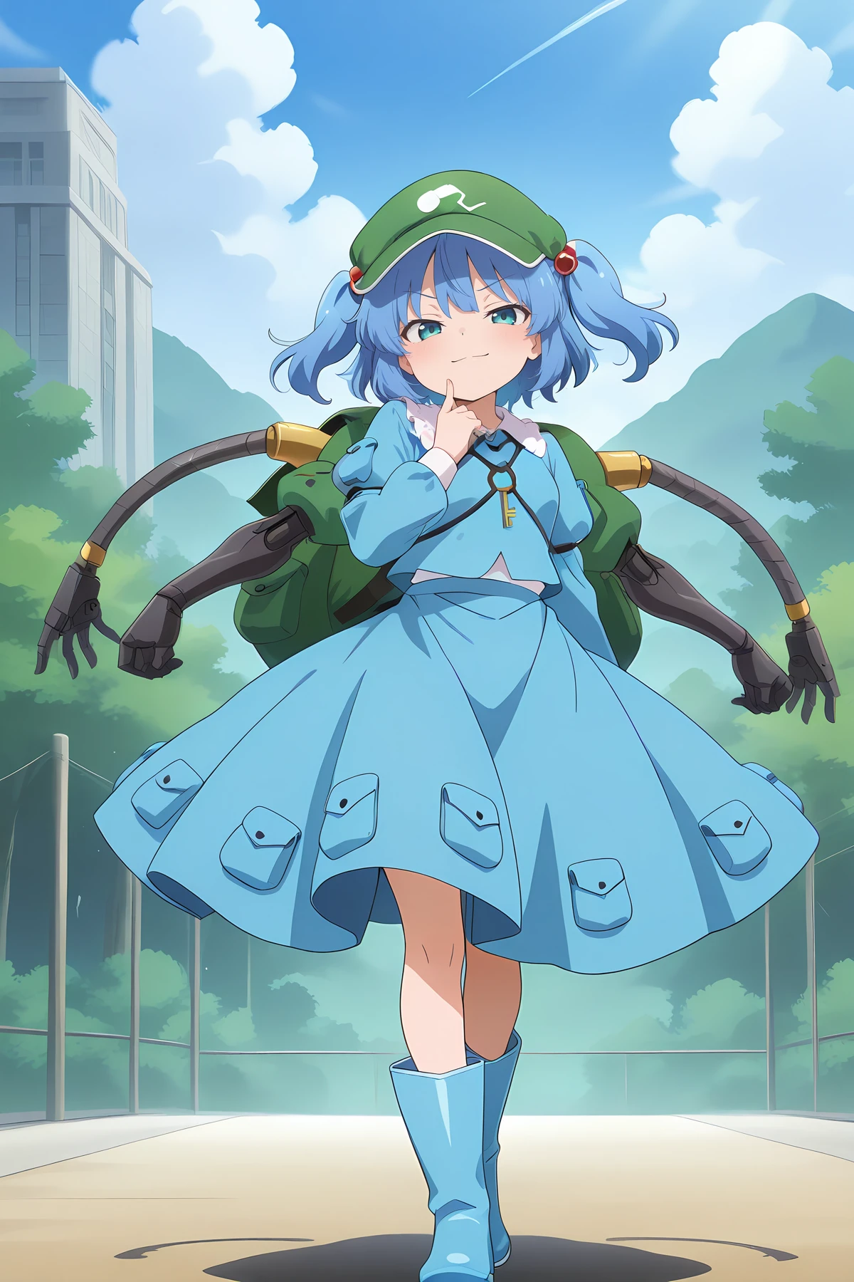 kawashiro nitori \(pseudo-shikigami: myoudouki giken\), alternate costume, alternate color, frilled dress, key, blue headwear, blue flat cap, long sleeves, blue backpack, white dress, tabard, blue tabard, blue footwear, rubber boots, pocket,