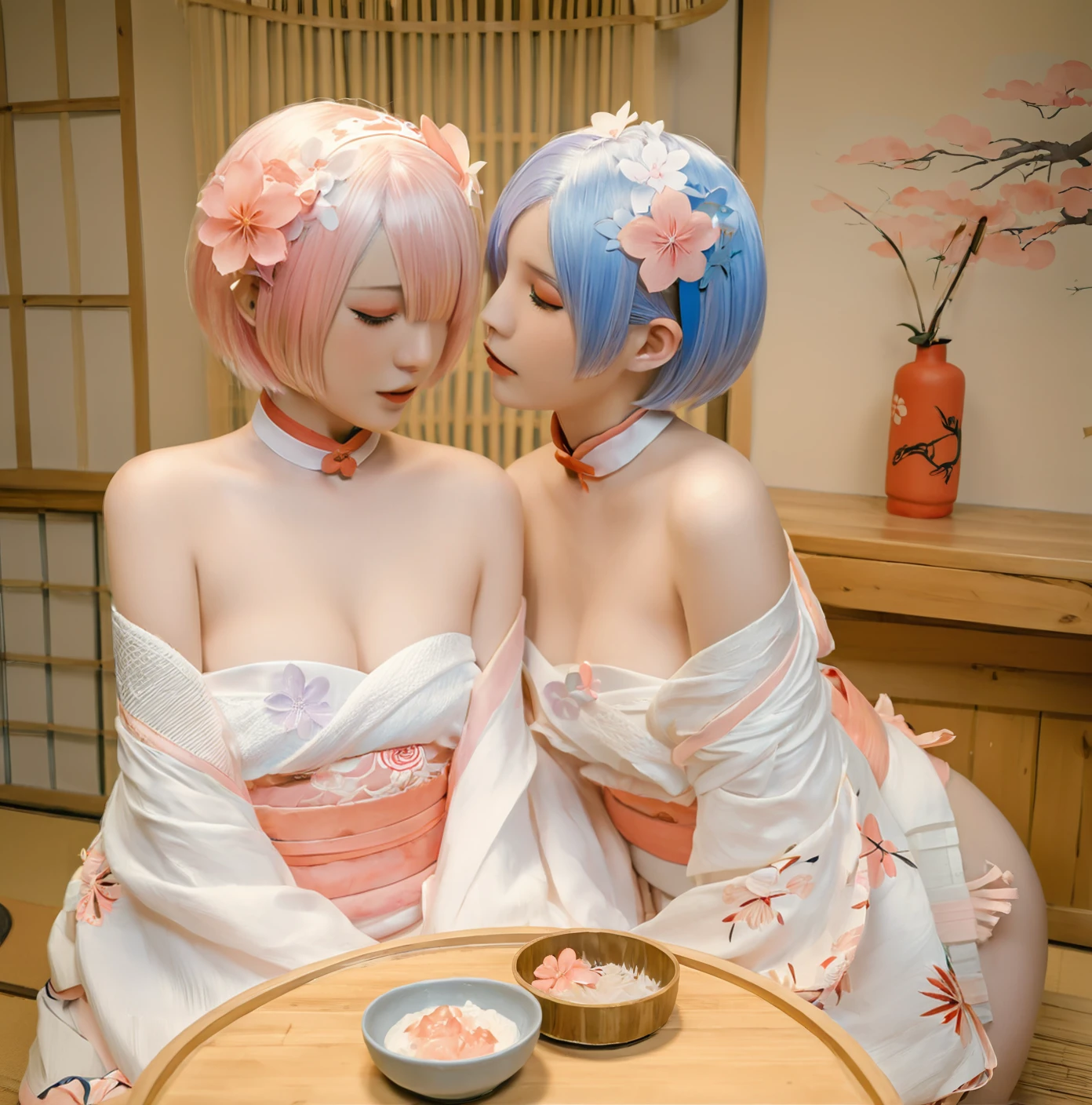 ram \(re:zero\), rem \(re:zero\), sisters, short hair, siblings, ???????, kimono, breasts, blue hair, japanese clothes, multiple girls, 2girls, twins, pink hair, realistic, indoors, sitting, small breasts, x hair ornament, closed eyes, hair ornament, hair over one eye, tongue, medium breasts, tongue out, yuri, off shoulder, choker, collarbone, open mouth, indoor environment