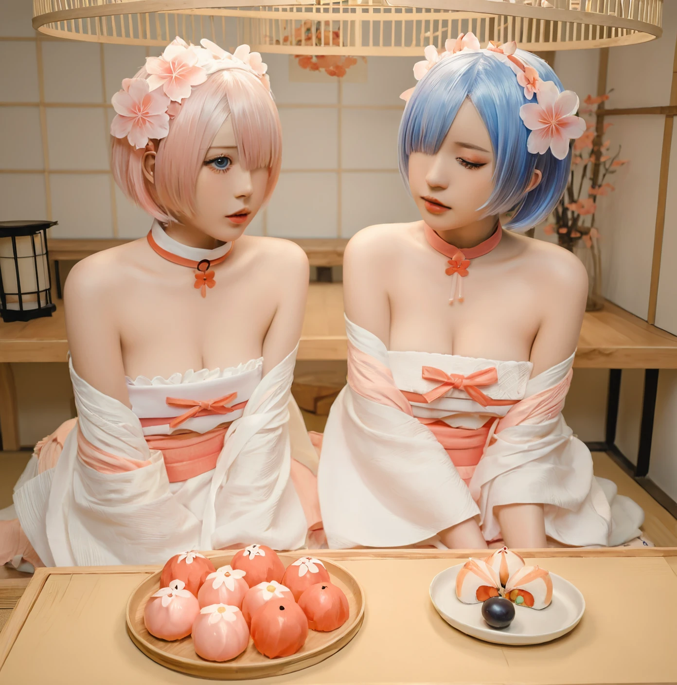ram \(re:zero\), rem \(re:zero\), twins, siblings, sisters, pink hair, short hair, blue hair, multiple girls, 2girls, web address, hair ornament, japanese clothes, x hair ornament, realistic, kimono, blue eyes, choker, looking at viewer, indoors, hair over one eye, pink choker, breasts, hair flower, pink eyes, lips, food, off shoulder, bare shoulders, open mouth, table, pink kimono, flower, patreon username, painting \(object\), holding, wide sleeves, medium breasts, small breasts, hairband, floral print, indoor environment