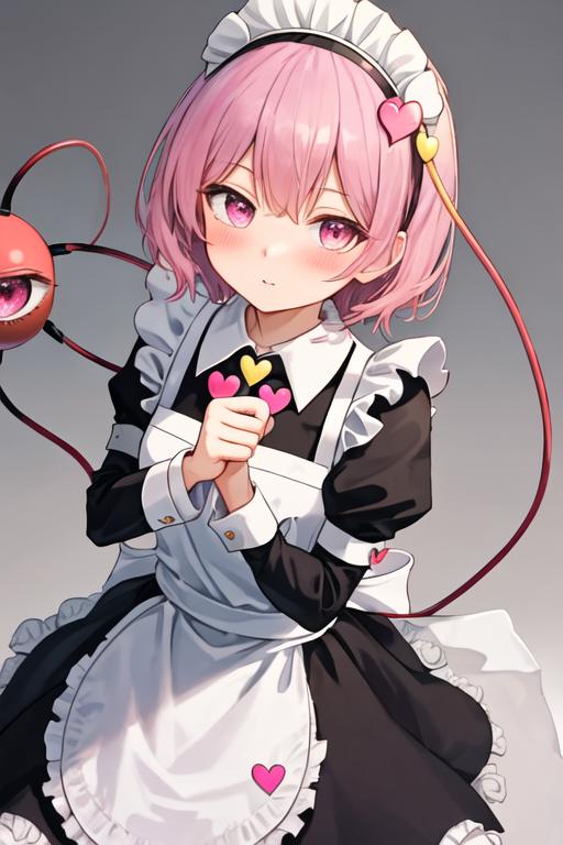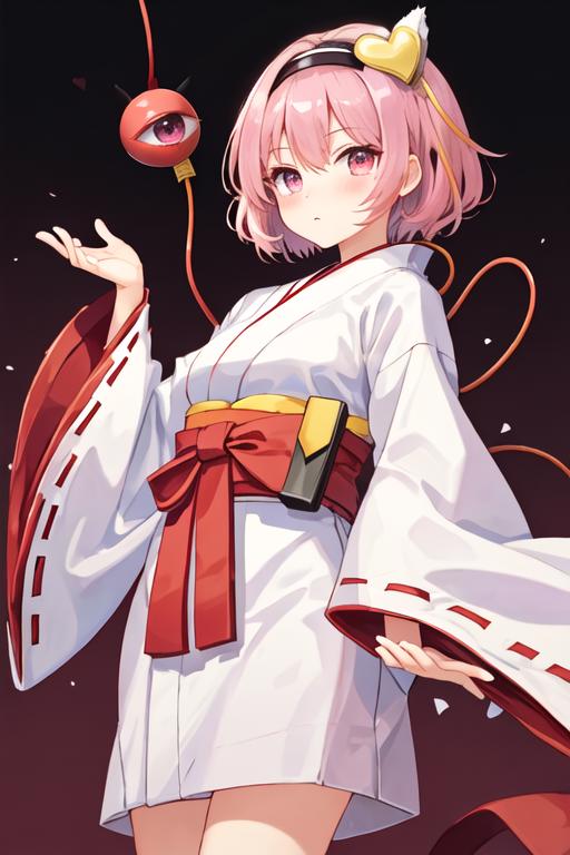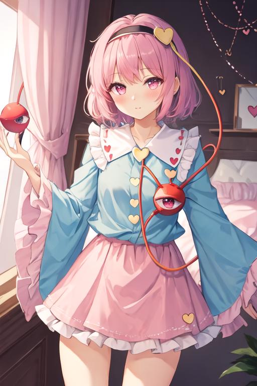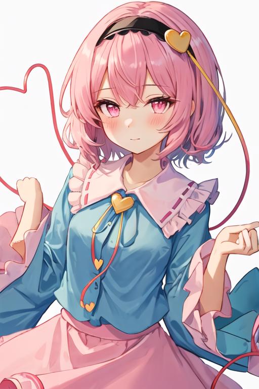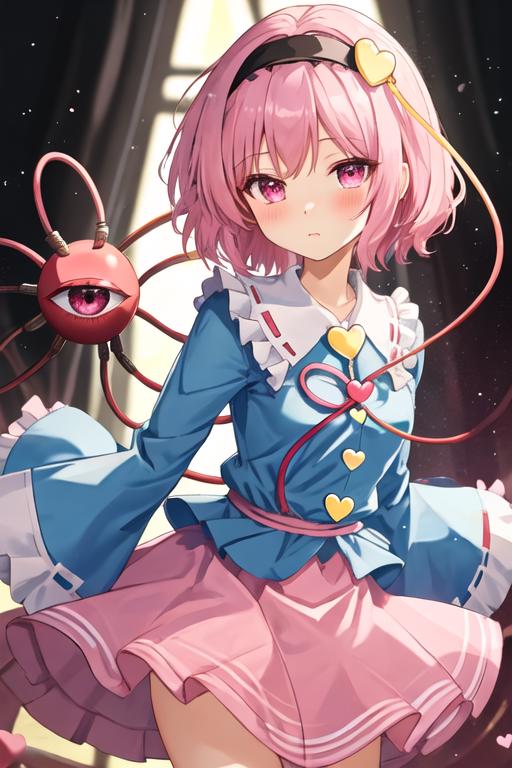 The trigger word is komeiji_satori_touhou, and the recommended tags are best quality, masterpiece, highres, solo, {komeiji_satori_touhou:1.15}, heart, short_hair, hairband, pink_hair, third_eye, pink_eyes, blush, hair_ornament, heart_hair_ornament.