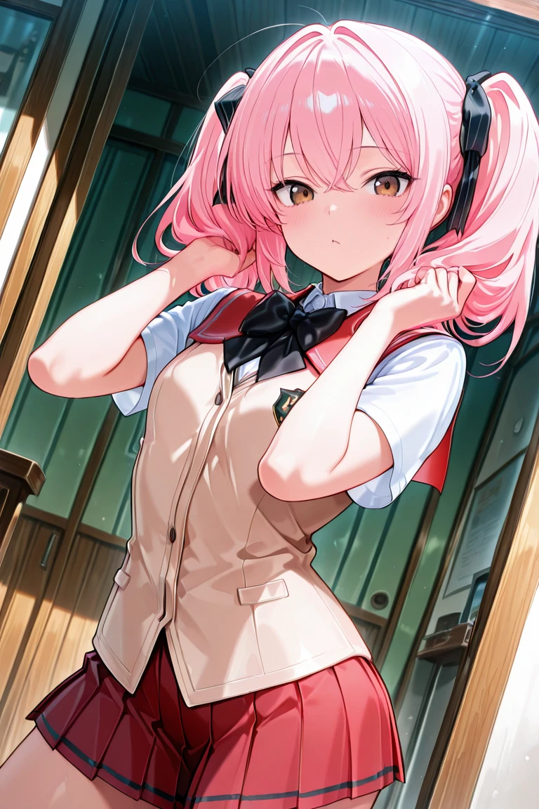 Narika Shihodo, 1girl, long hair, pink hair, twintails, brown eyes, hair bow, small ???????, white collared shirt, beige vest, black bowtie, red sailor seifuku, red pleated skirt