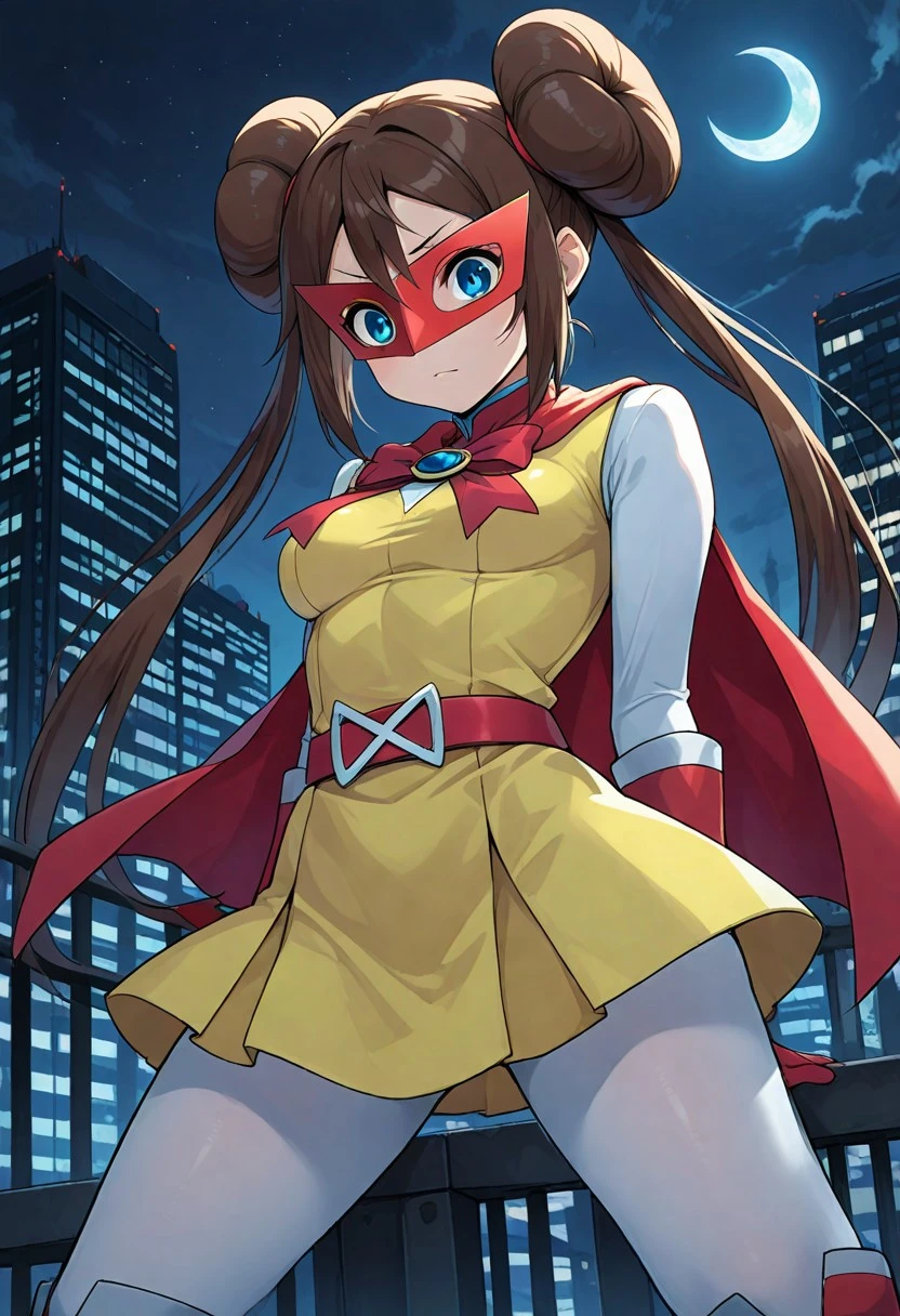 rosagirl, brown_hair, blue_eyes, double_bun, twintails, superhero, yellow_dress, white_sleeves, red_cape, domino_mask, red_mask, red_gloves, belt, white_pantyhose, red_footwear, knee_boots