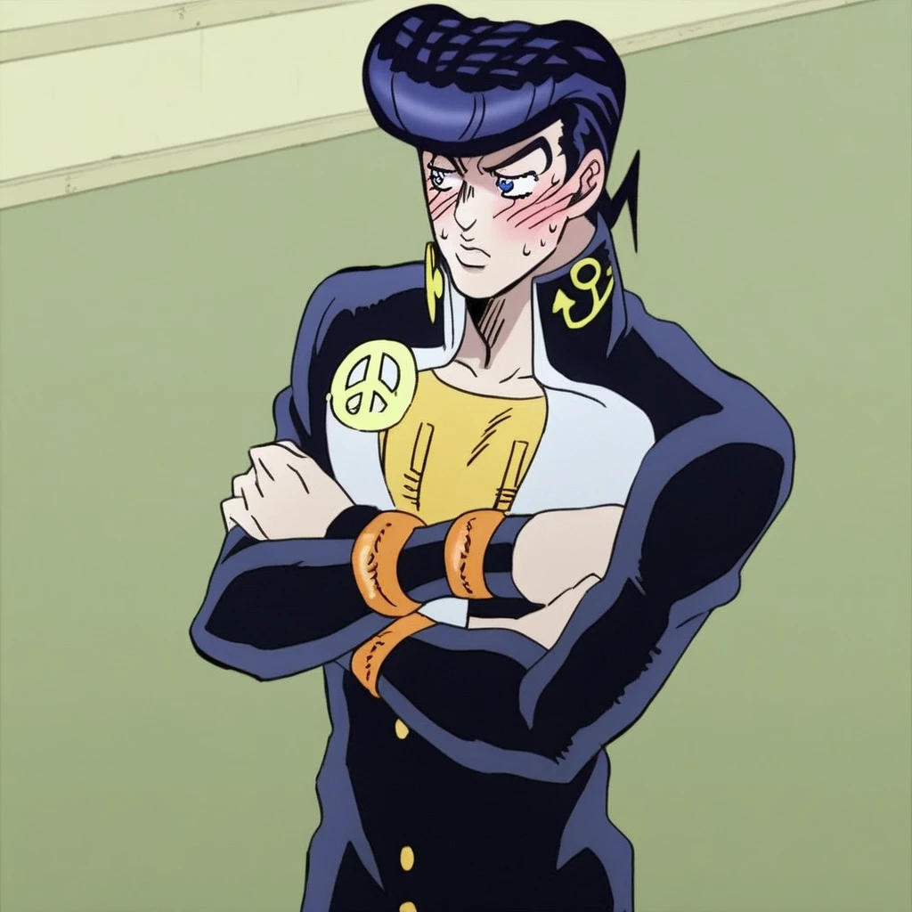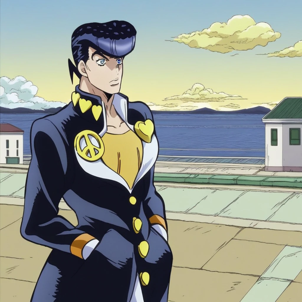 Josuke Higashikata, JoJo, JoJo style, pompadour, gakuran, school uniform, heart brooch, anchor symbol, peace symbol, blue eyes, black hair, stud earrings,