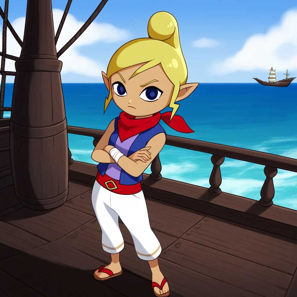 red neckerchief, blue vest, purple shirt, white pants, red belt, wrist wraps, sandals