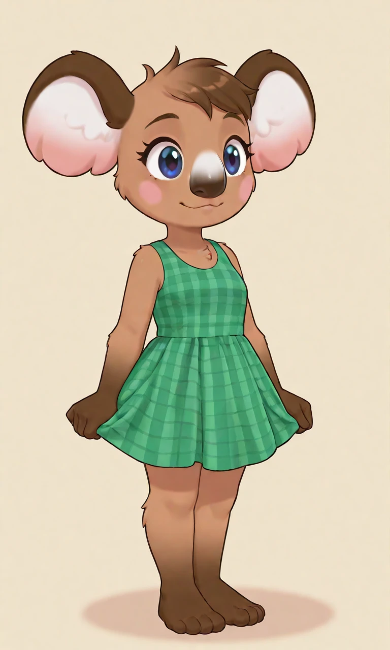Melba-AC, Koala, brown fur, dark brown ears with pink on the inside, white and black nose, pink cheeks, green checkered dress, dark blue eyes, Brown skin with dark brown tips, barefoot, 1female, solo