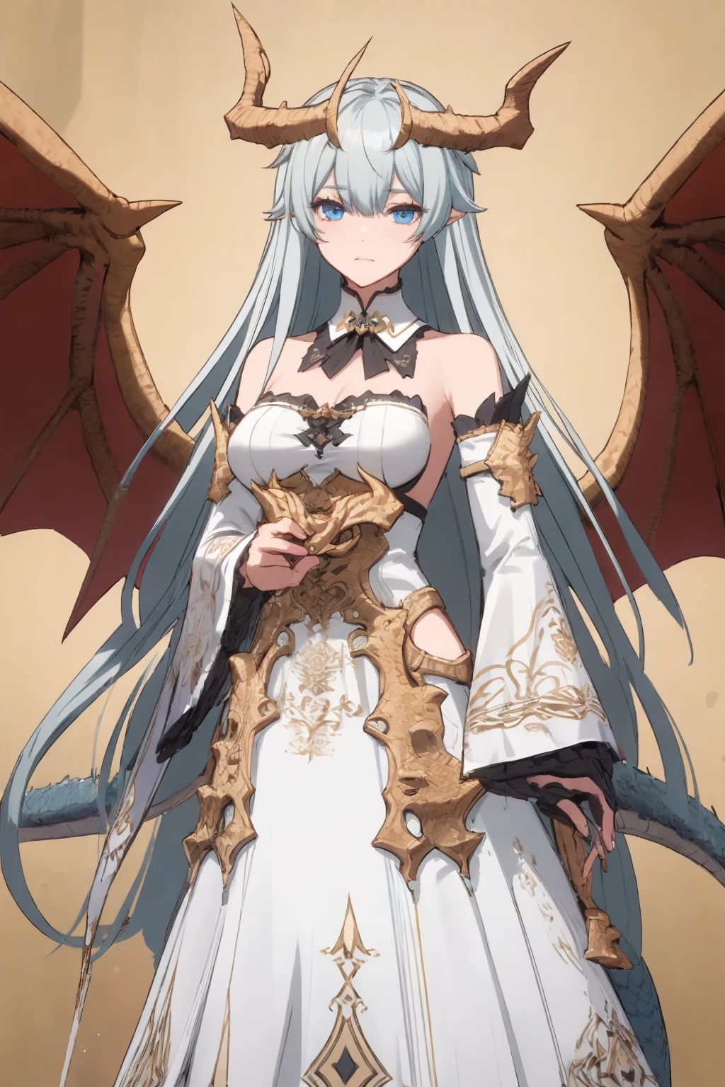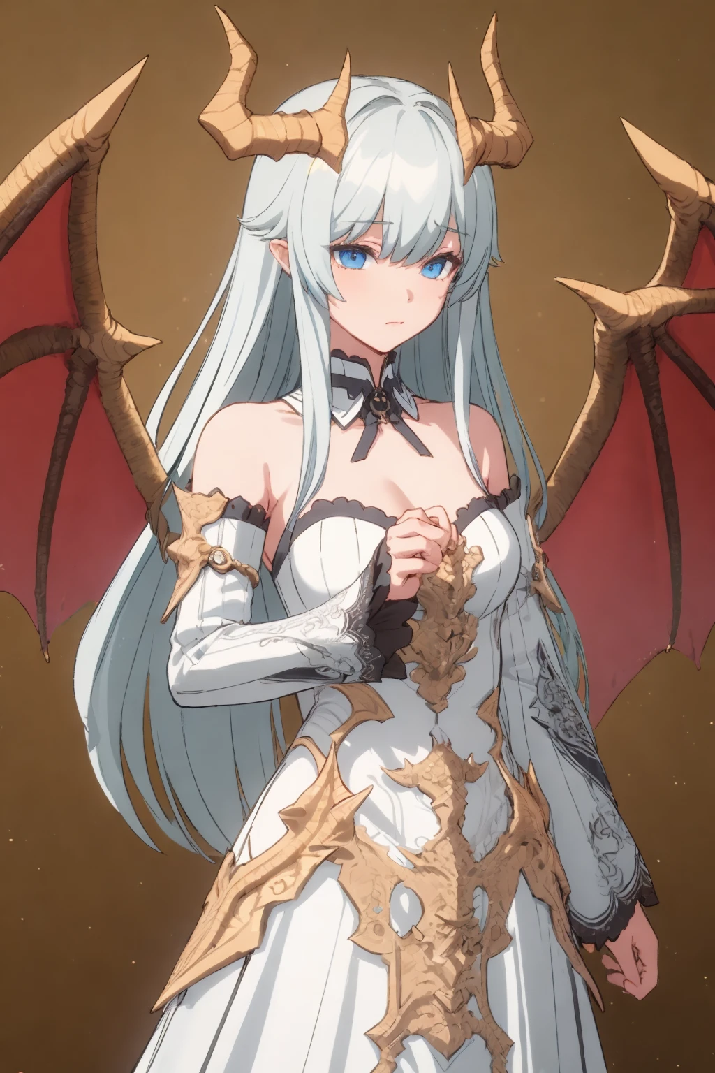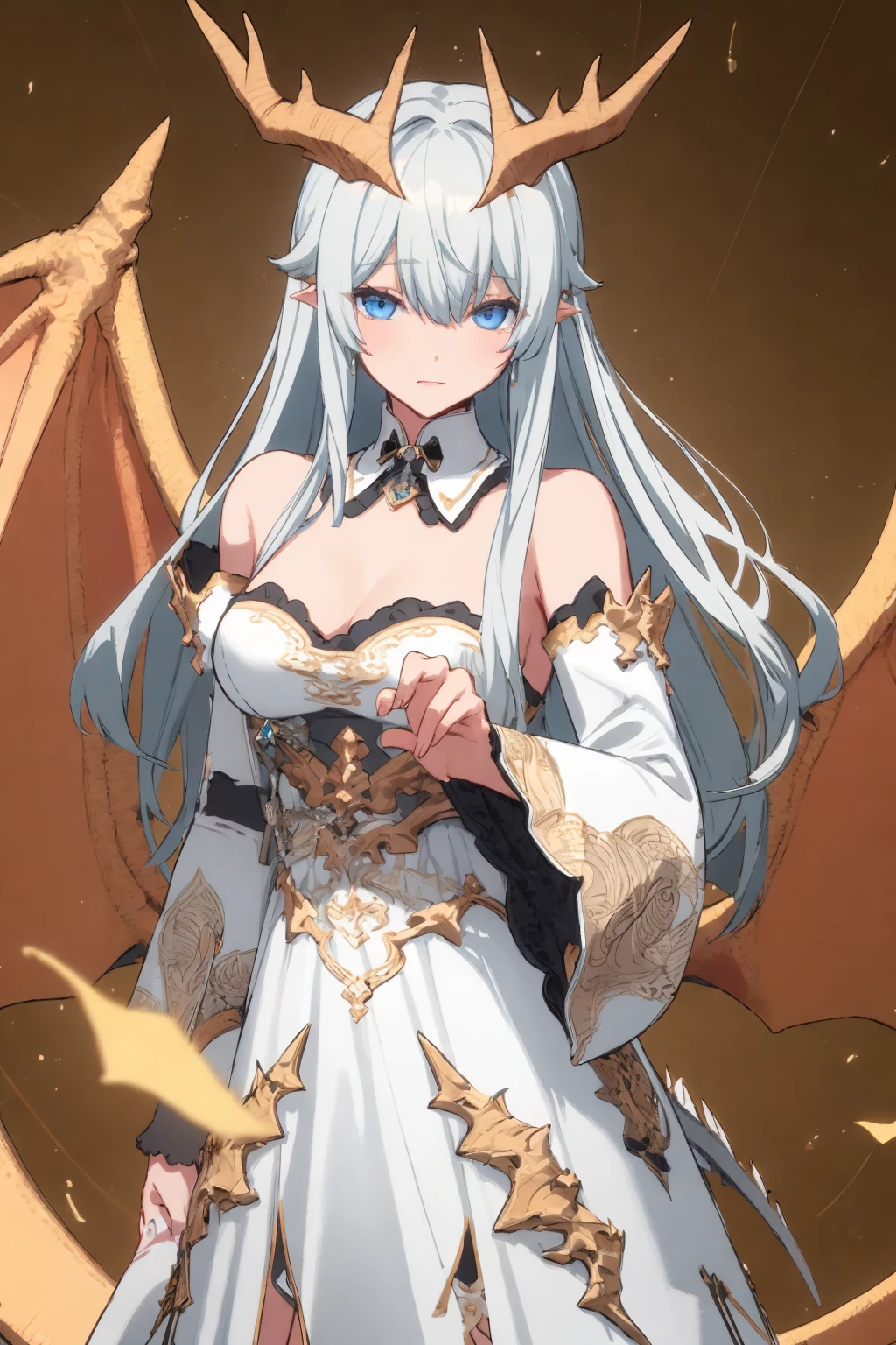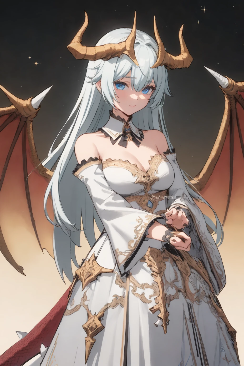 1gril, blue eyes, white dress, detached sleeves, dragon girl, white long hair, bare shoulders, dragon horns, dragon wings, bangs, detached collar