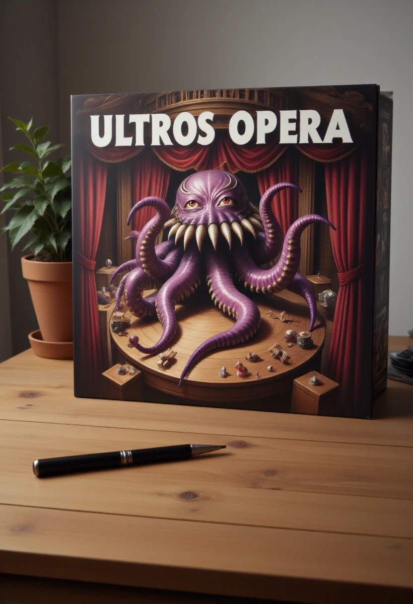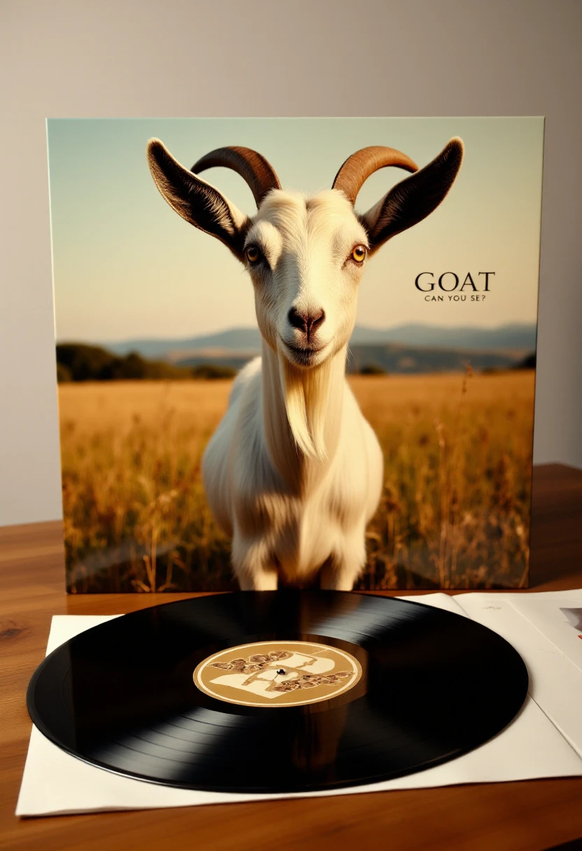 Photograph of a vinyl record cover titled "(TEXT)" on a wooden table, featuring (THEME/STYLE) artwork. The cover depicts (SUBJECT/LOCATION).