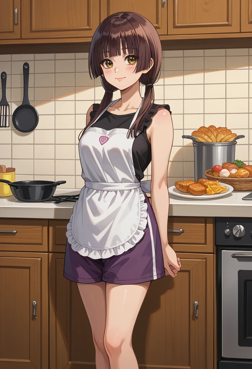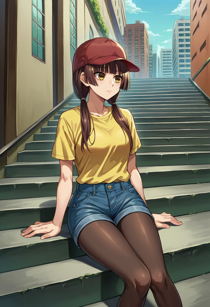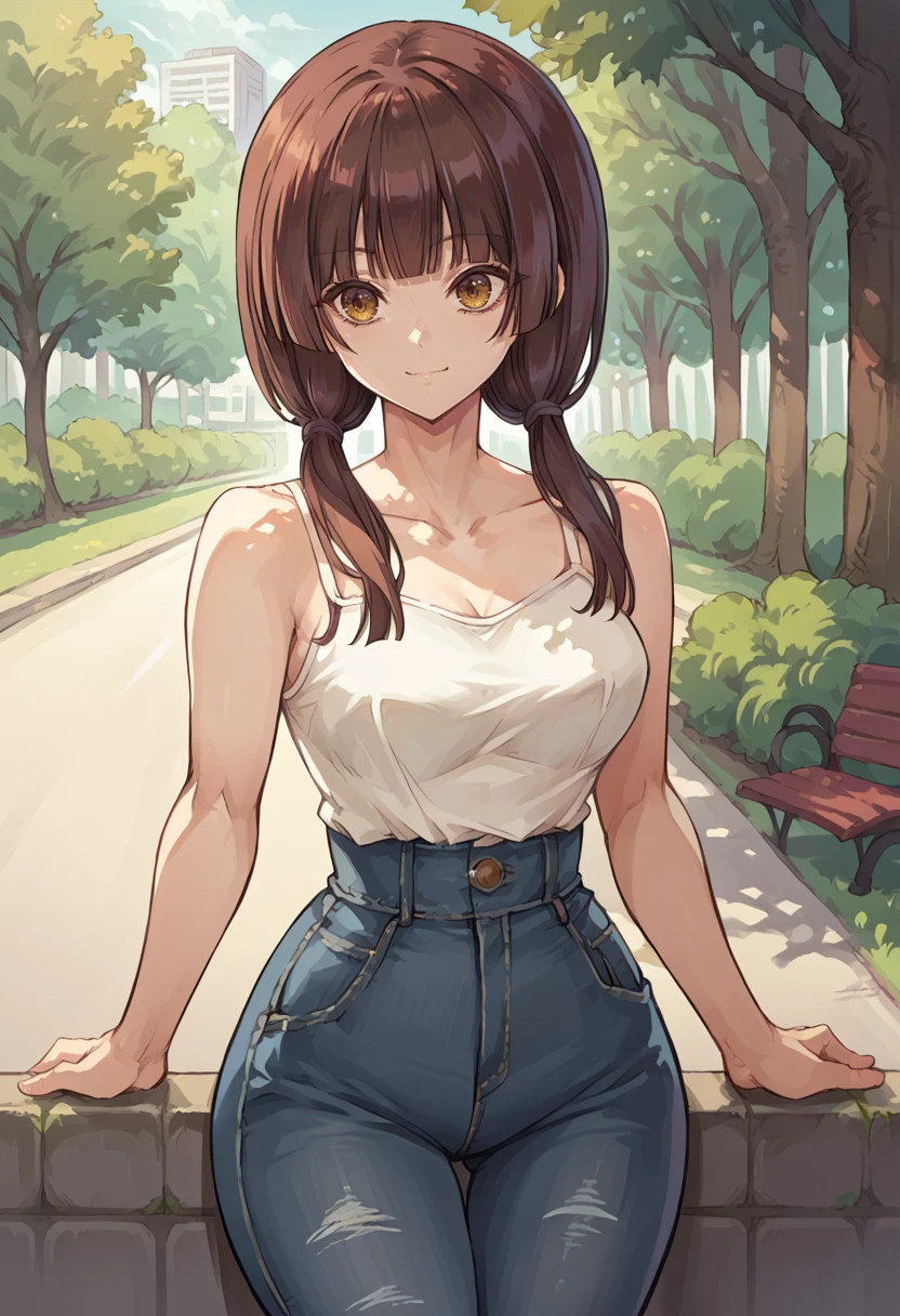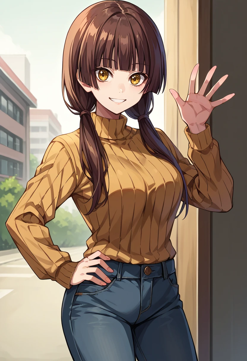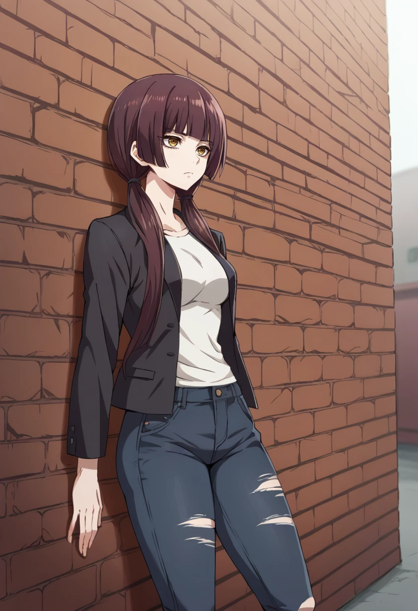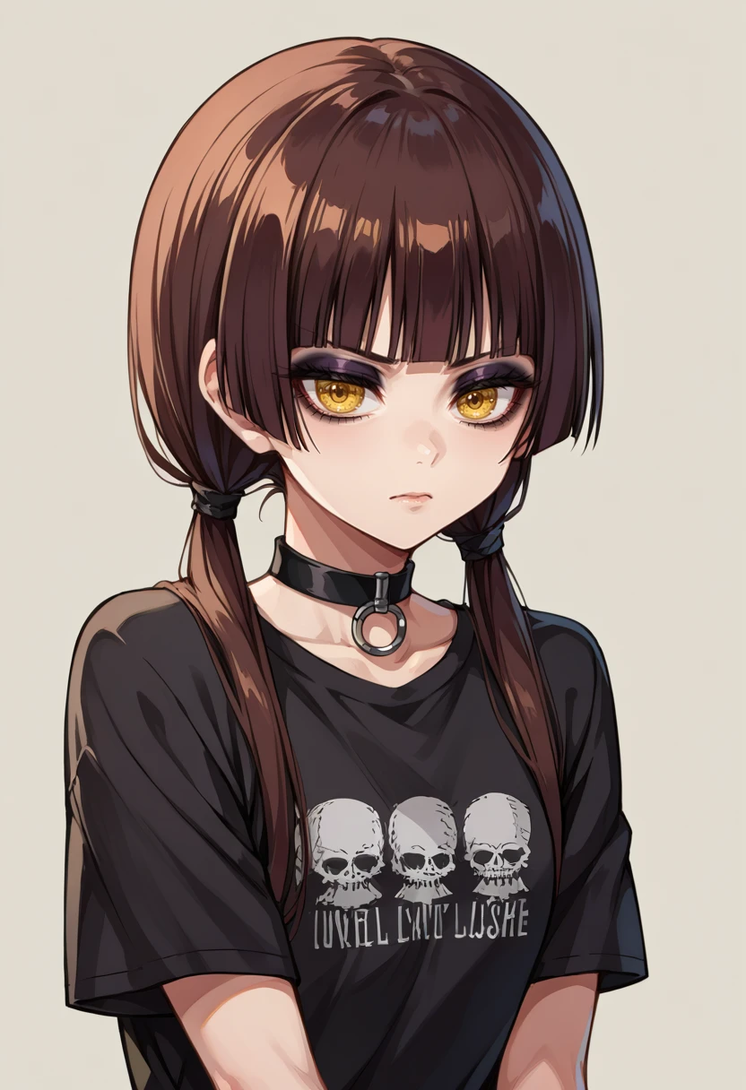 HarumiTaniguchi, yellow eyes, brown hair, long hair, low twintails, blunt bangs, blunt endsDefault outfit:
