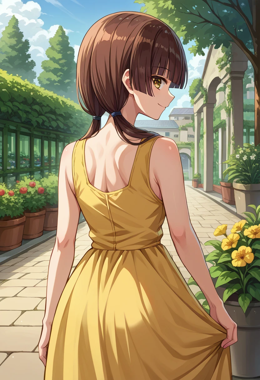 HarumiTaniguchi, yellow eyes, brown hair, long hair, low twintails, blunt bangs, blunt ends