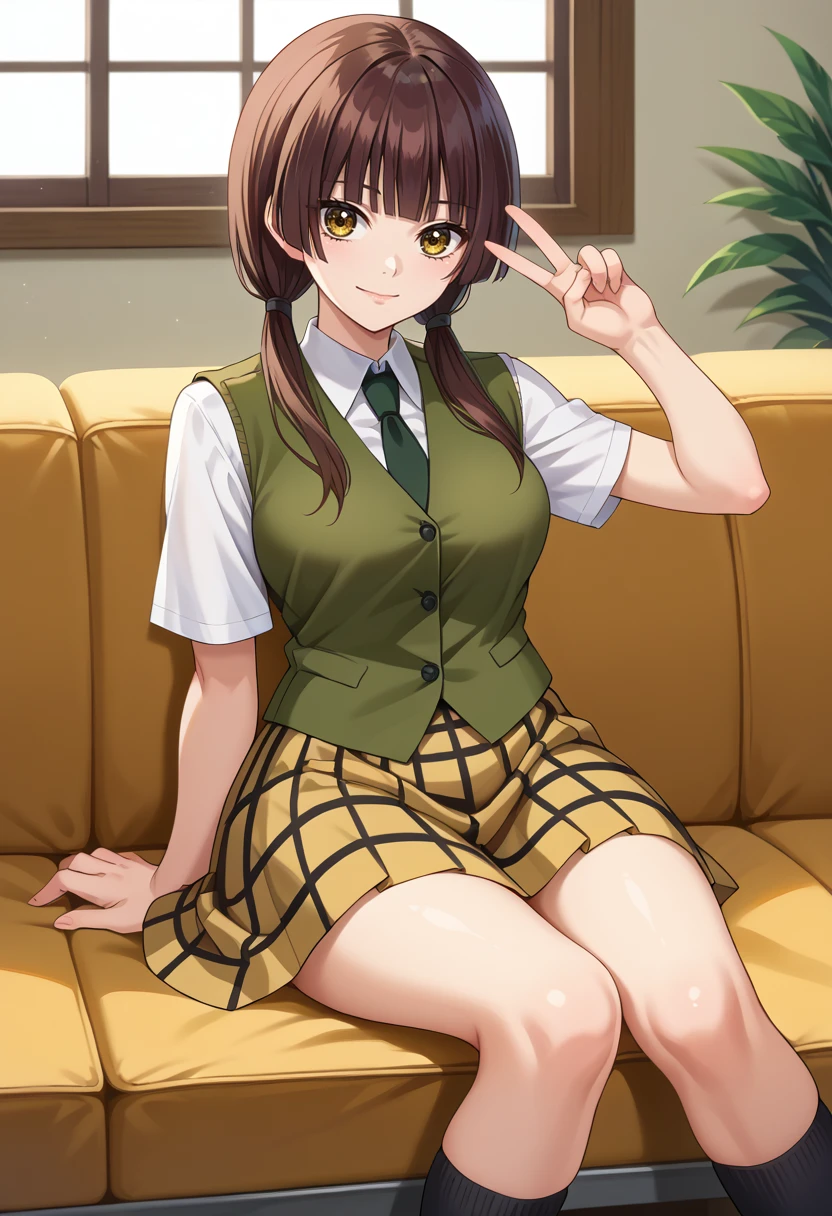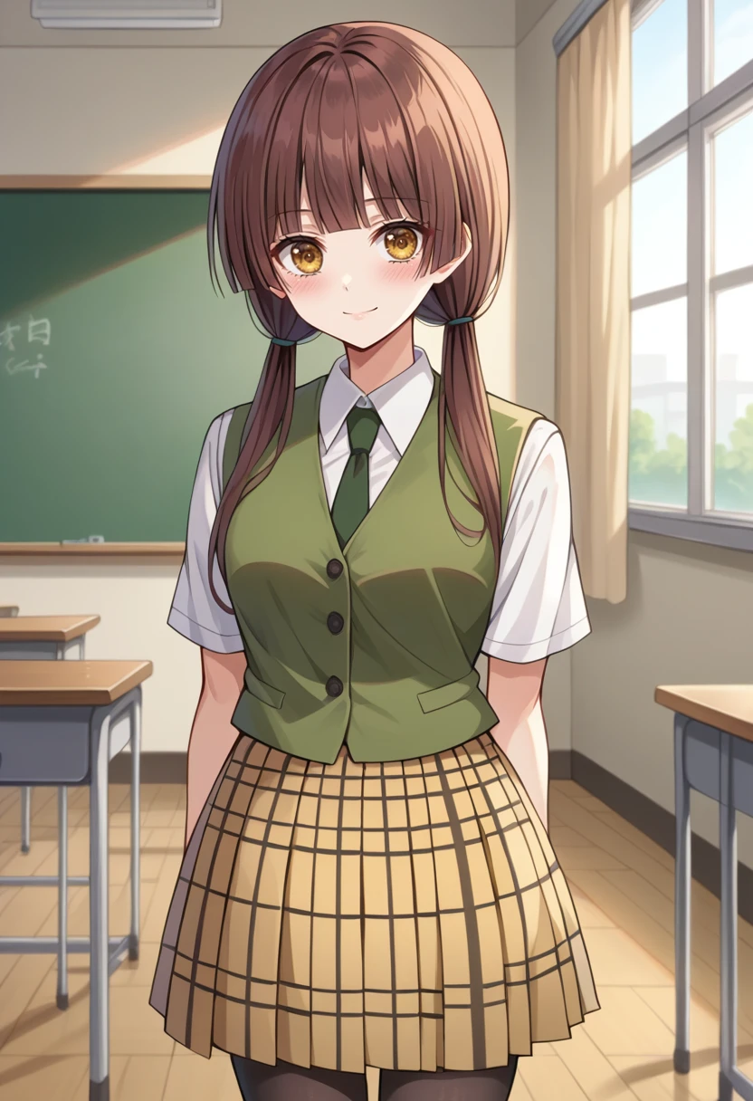 HarumiTaniguchi, yellow eyes, brown hair, long hair, low twintails, blunt bangs, blunt ends, white dress shirt, green vest, black necktie, yellow skirt, plaid skirt, black socksLet me know if you have any issues.